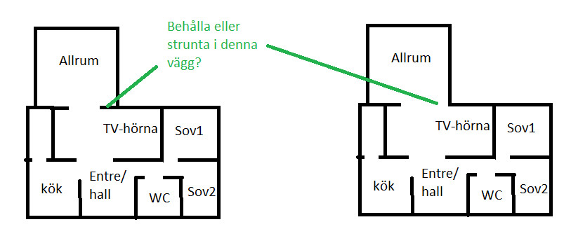 2) Då vi har tv-soffan mot denna vägg gör väggsnutten att soffan inte kommer att "sticka ut" utanför hörnet. Soffan är ungefär lika bred som väggen + väggsnutten. Tar du bort väggsnutten kommer soffan att synas från allrummet ca 50 cm.