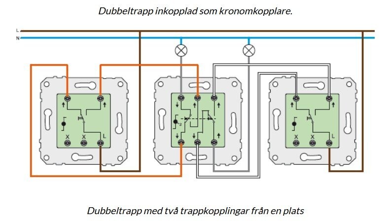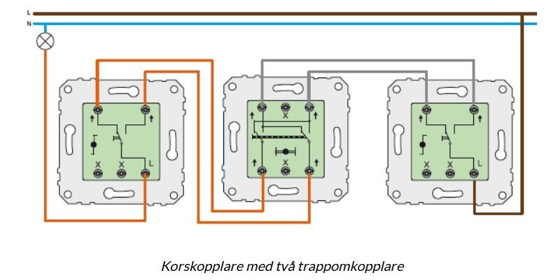 Ursäkta, jag insåg att jag hade bifogat fel bild tidigare. Den korrekta kopplingslösningen är en korsomkopplare, inte en dubbeltrapp/kronomkopplare som jag först visade. Beklagar förvirringen, här kommer den korrekta bilden.