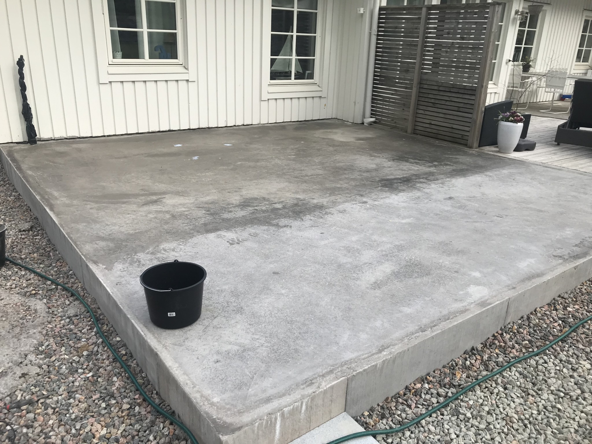 Har gjutit en betongplatta som i det stora hela blev bra men som blev lite för låg i mitten / bakkant så skulle behöva fylla upp med ca 120l för att få den i jämn nivå.