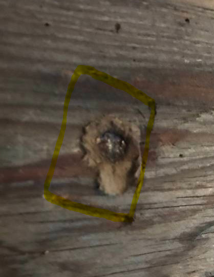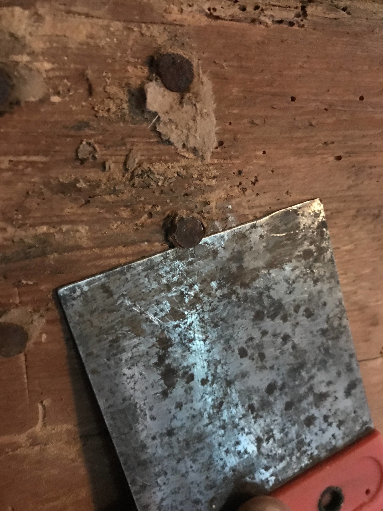 Med tanke på hur kraftigt försänkt spikskallen sitter i träet och hur man ser avtrycket från hammarskallen i träet gissar jag att det inte är frågan om någon liten pappspik utan lite rejälare doningar. Blir svårt att få ut utan att skada träet.