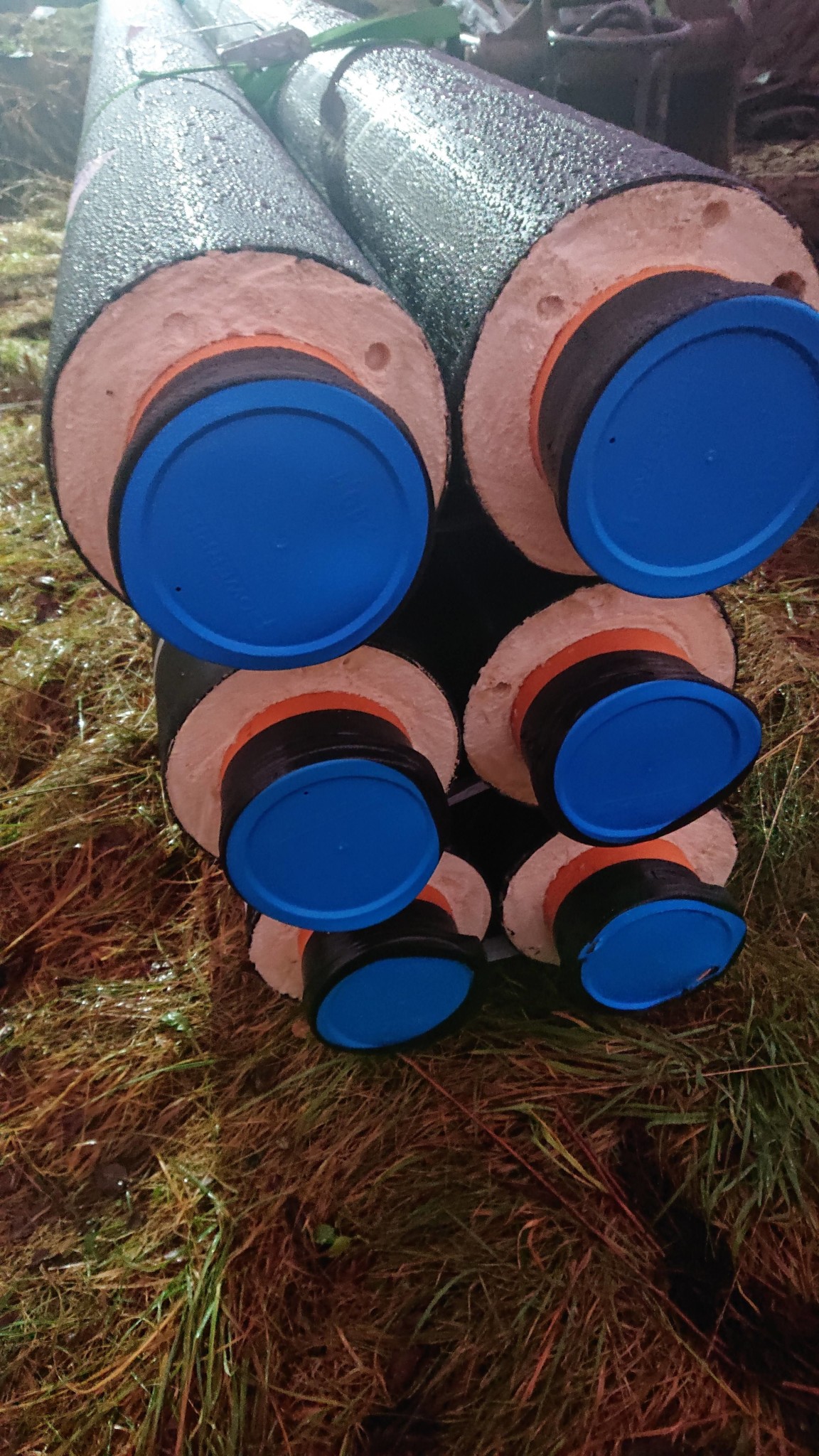 2. Alternativet till tjäldjup är att lägga på ett snålare djup, 0,5 meter i mitt fall. och lägga en värmekabel samt isolering runt - frostvakt så att kabeln endast värmer vid behov.