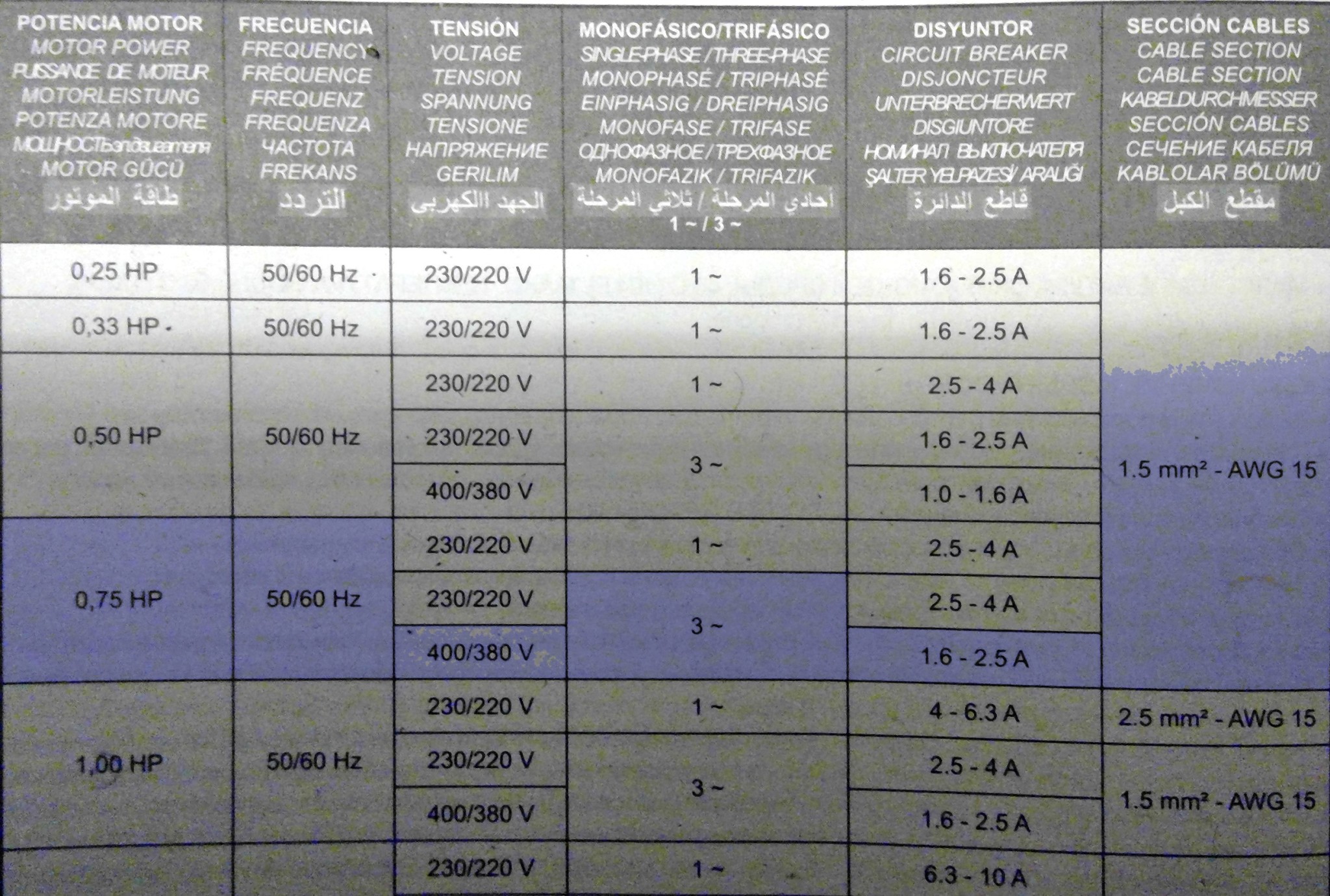 Vill bara dubbelkolla att jag tolkar dokumentationen för min nya trefas poolpump rätt. Enligt märkskylt på pumpen står det 1.5A och i det knapphändiga dokument som medföljer står det avsäkring 1,6-2,5A. Se bifogade bilder där jag markerat det som gäller för 0,75hp trefas.