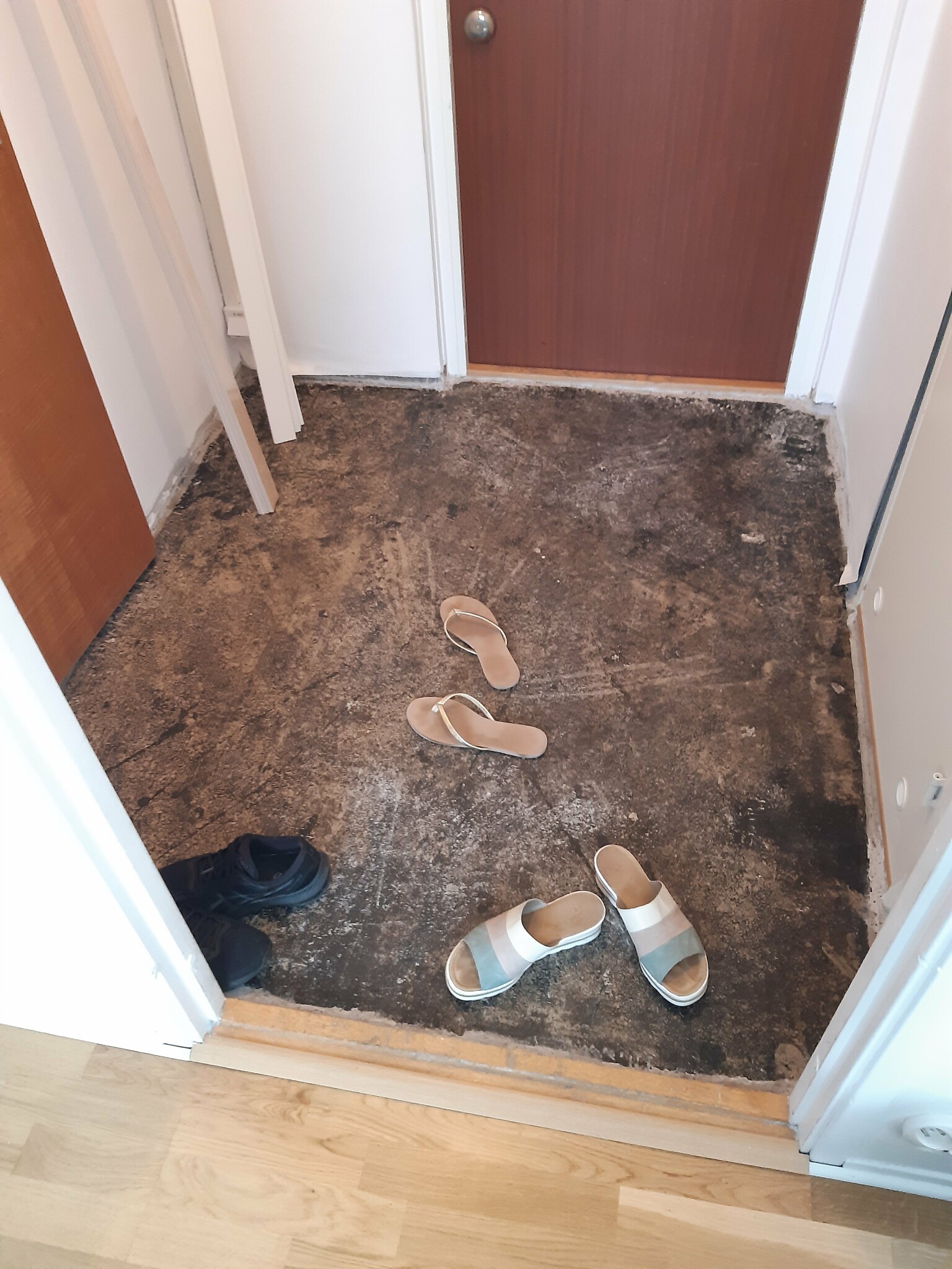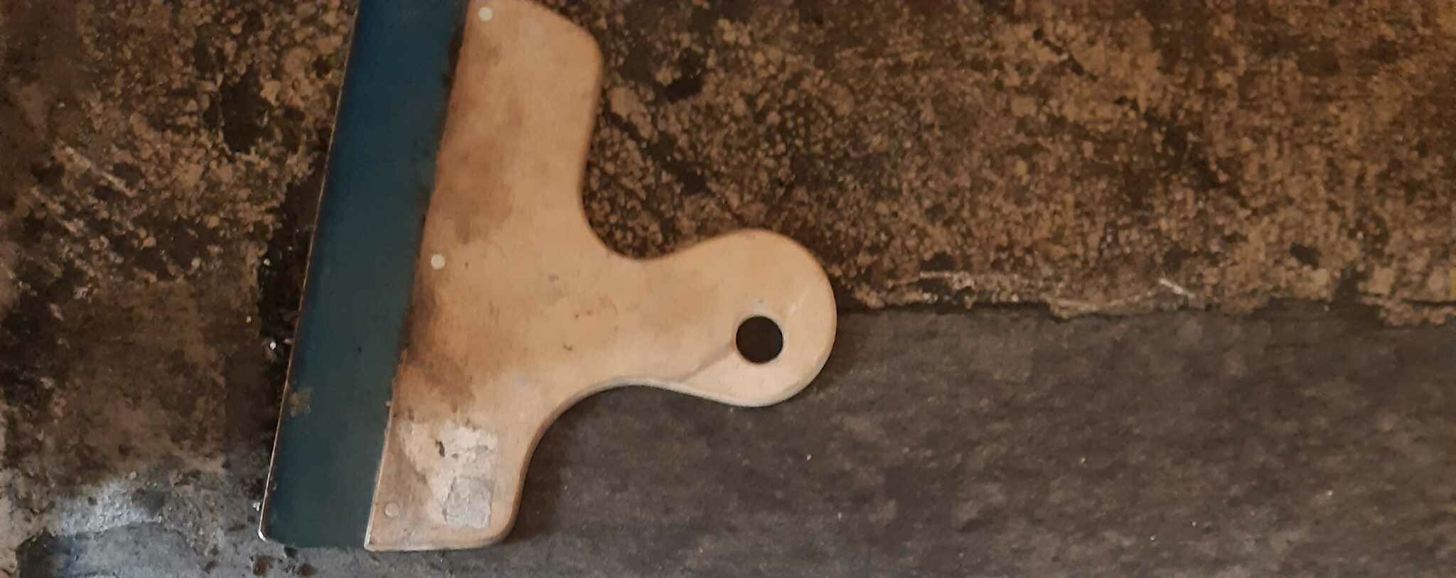 1. Jag har ett golv som tidigare hade tjärpapp. Jag lade vatten på och skrapade av pappen helt. Därefter lyckades jag skrapa av större delen av själva tjäran (men såklart inte allt). Se bilder.