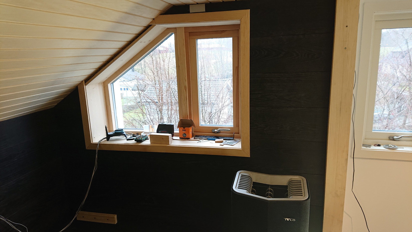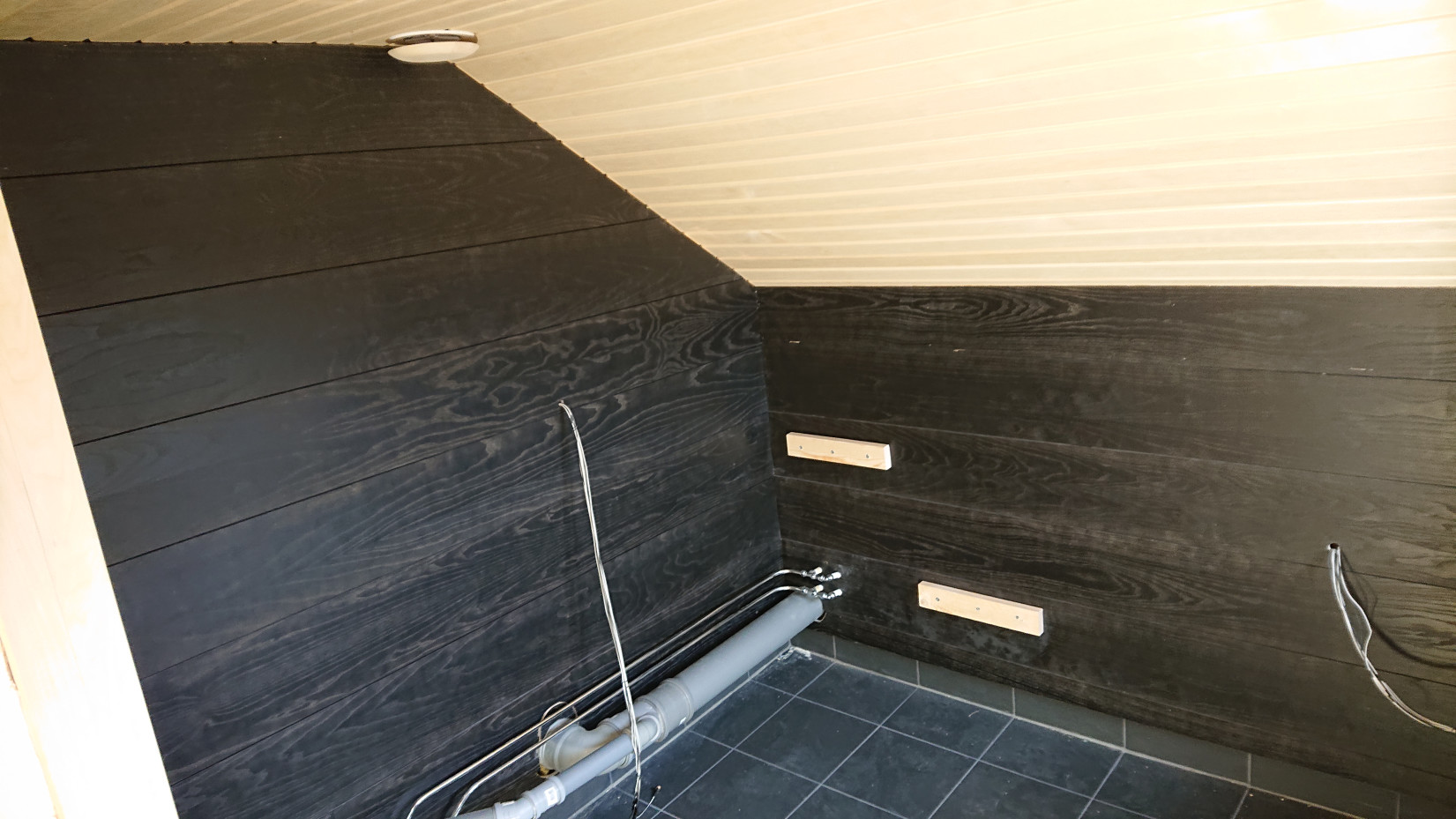 De träfärgade blocken som ses på väggarna är stöden för bastulavarna. Jag har alltså byggt samtliga lavar lösa för att kunna komma åt/lätt bygga om så att man kan göra en sängplats för gäster.