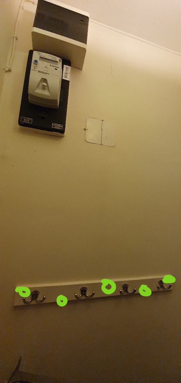 Jag ska sätta upp min hatthylla, som jag tog ned för många år sen, som är placerad under elmätaren. Då spacklade jag igen skruvhålen, så de bör jag ju inte använda igen (trasiga plugg inuti dessutom). Jag behöver borra nya hål antingen ovanför eller nedanför de gamla. (Jag har dessutom extra skruvhål, på vänstra sidan under elmätaren, då hyllan satt snett när jag flyttade in, och jag justerade det.) Nedanför det gamla översta hålet blir det aningens för lågt läge för hyllan och då är frågan om lite ovanför är ok, eller om det är för nära elmätaren och ev. kablar i väggen?