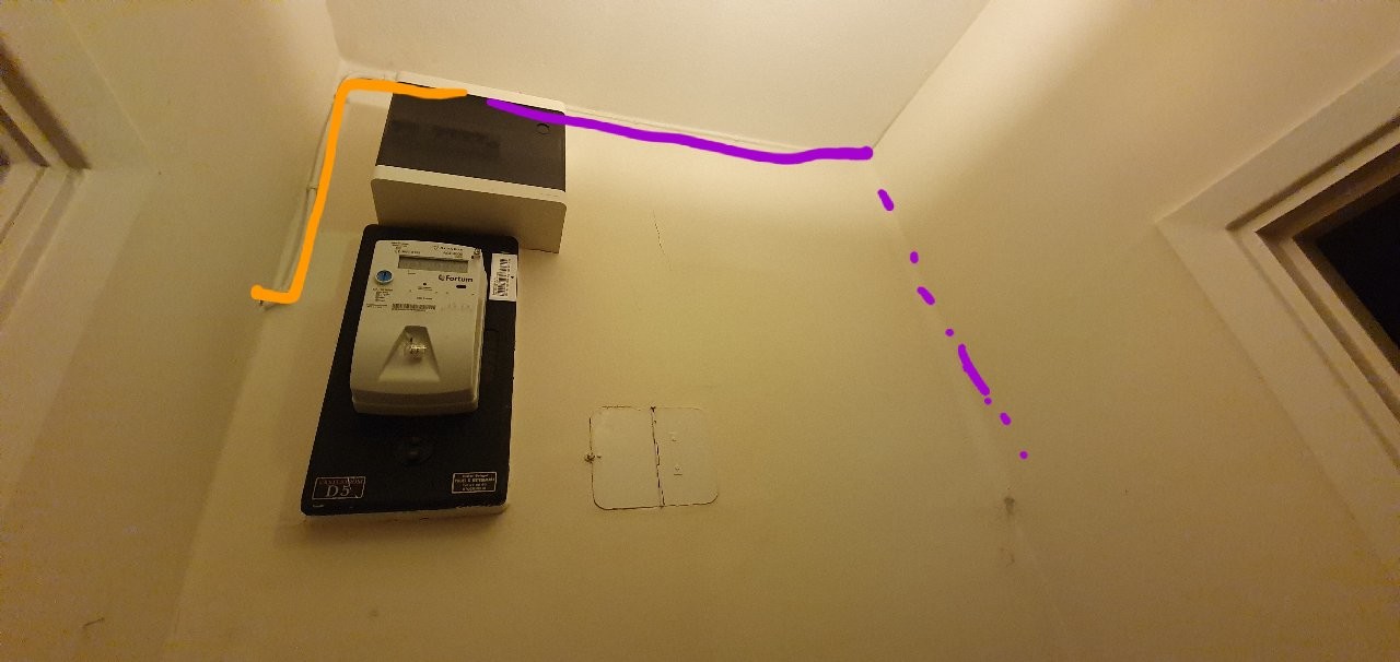Från proppskåpet eller elmätaren går en ledning synlig uppe vid taket: