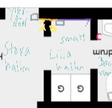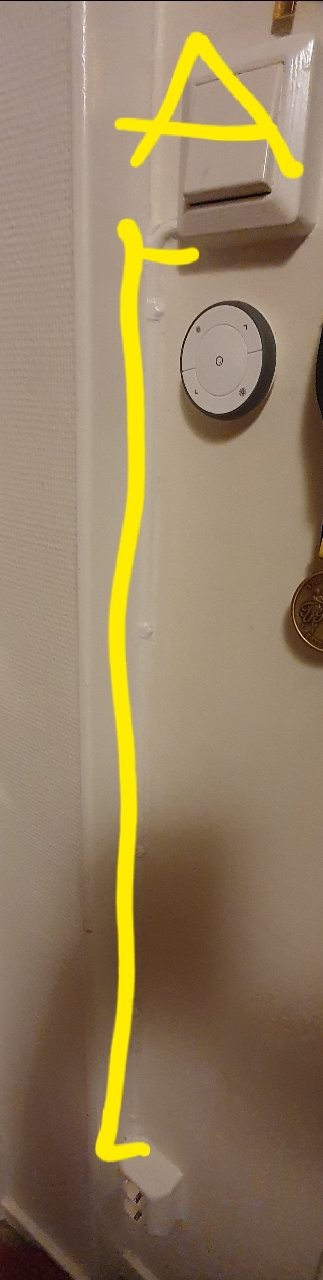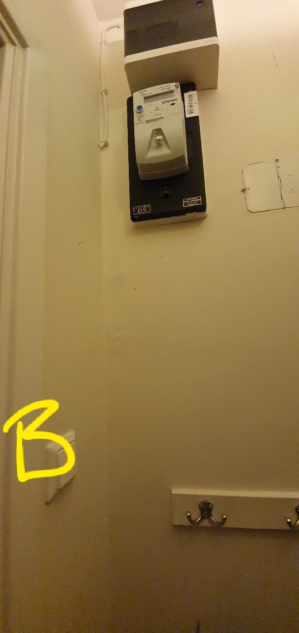 Till vänster på den smala väggen i smatten sitter en strömbrytare (gult B i bild) och på motsvarande plats på andra sidan den smala väggen sitter också en strömbrytare (gult A i bild) och från den går ledning ned till vägguttag (gul linje i bild).