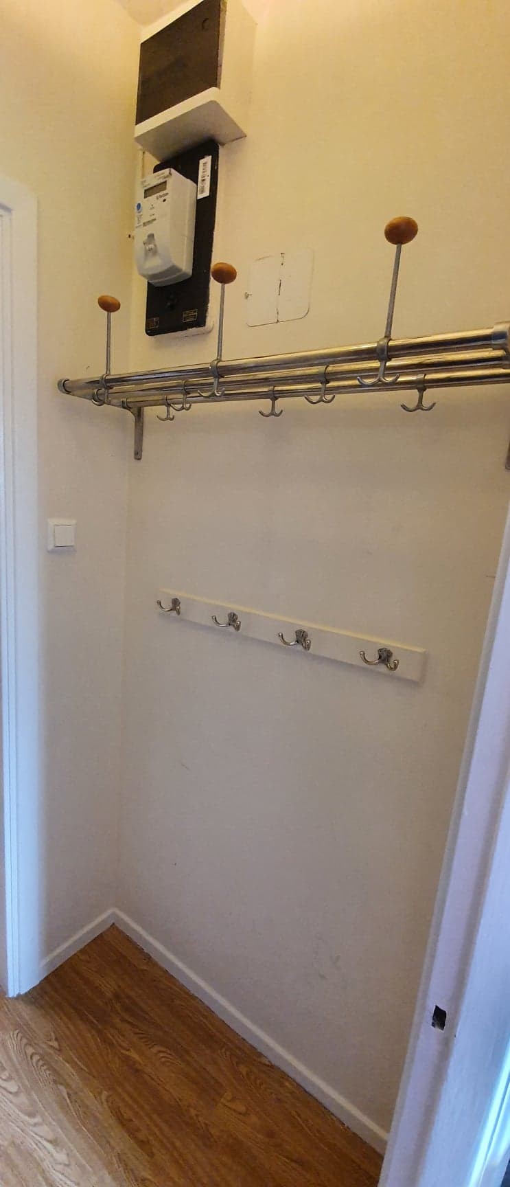 Tack. Ja, precis, 50-talslägenhet -- glömde skriva det. Elledningar utbytta på 90-talet. Luckan går inte att öppna (jo, säkert med våld) men är inte aktuellt att borra nedanför den. Det sitter f.ö. en originalbräda med krokar en bit ned på väggen (med spikar: gröna ringar i bild, samt skruvar i resp. krok).Bo.Siltberg skrev: