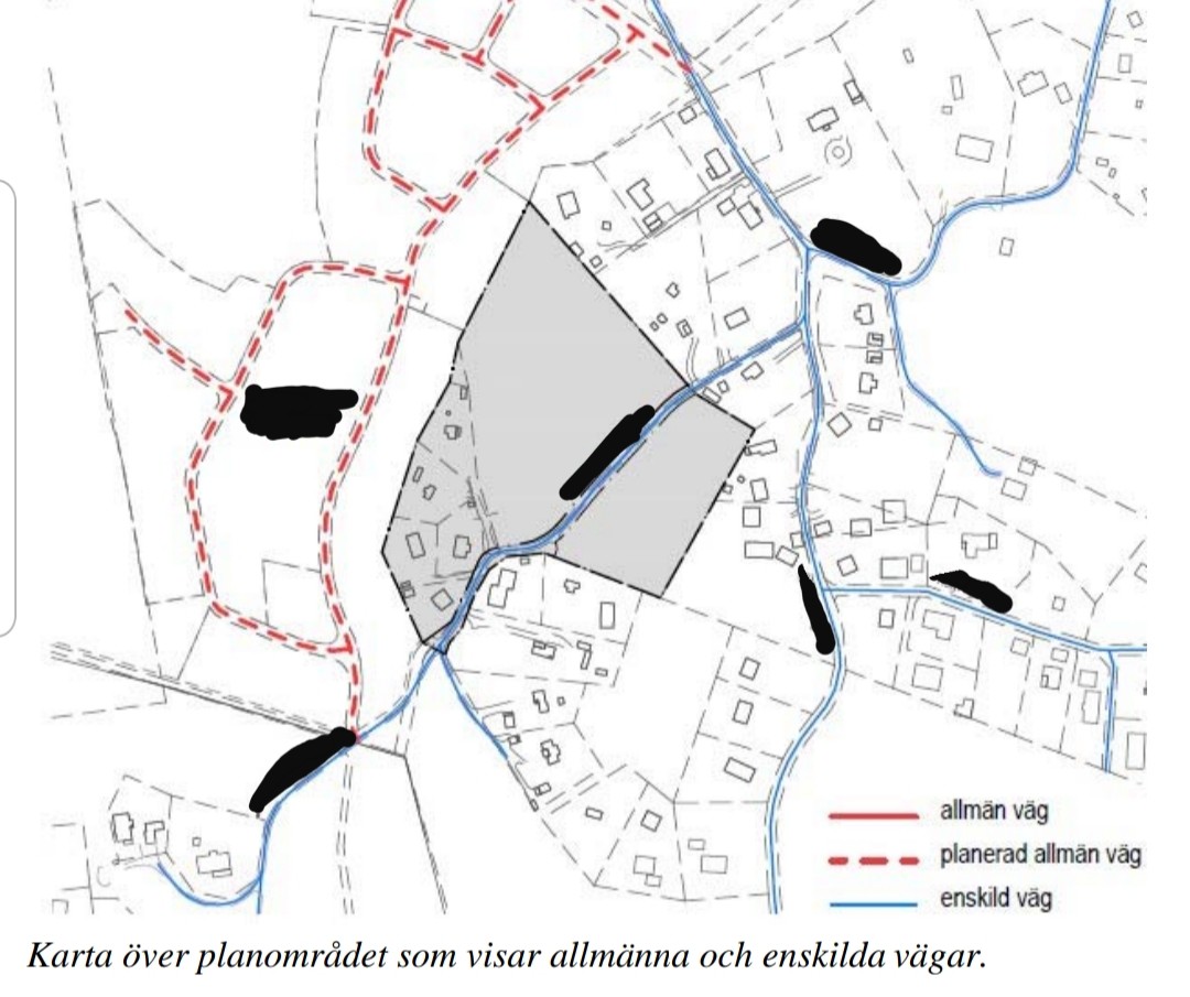 På en av stickvägarna (markerad med svart) så har en fastighet styckats av till 14st nya fastigheter och en ny lokalgata har bildats. Det är en husleverantör som har köpt fastigheten och gjort denna avstyckning och nu är fastigheterna till salu.