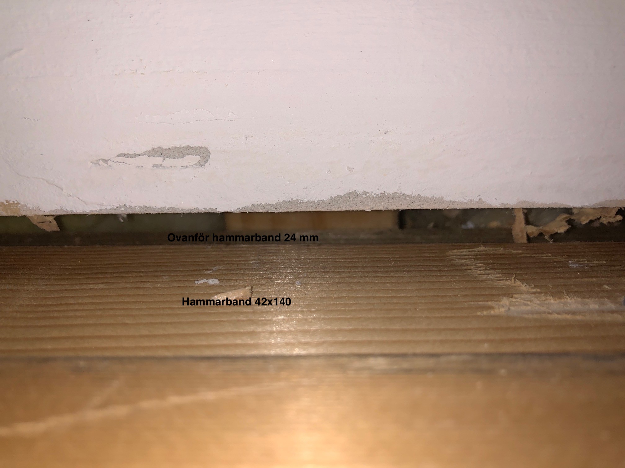 Det är ju toppen om vi kan ta bort det jag kallar hammarband. Då kan vi få in en balk på 140x225 och ändå få 206 cm i takhöjd. Det ser ut som att det ligger en tryckimpregnerad (25mm) ovanför hammarbandet, kanske lättast att låta den vara kvar?
