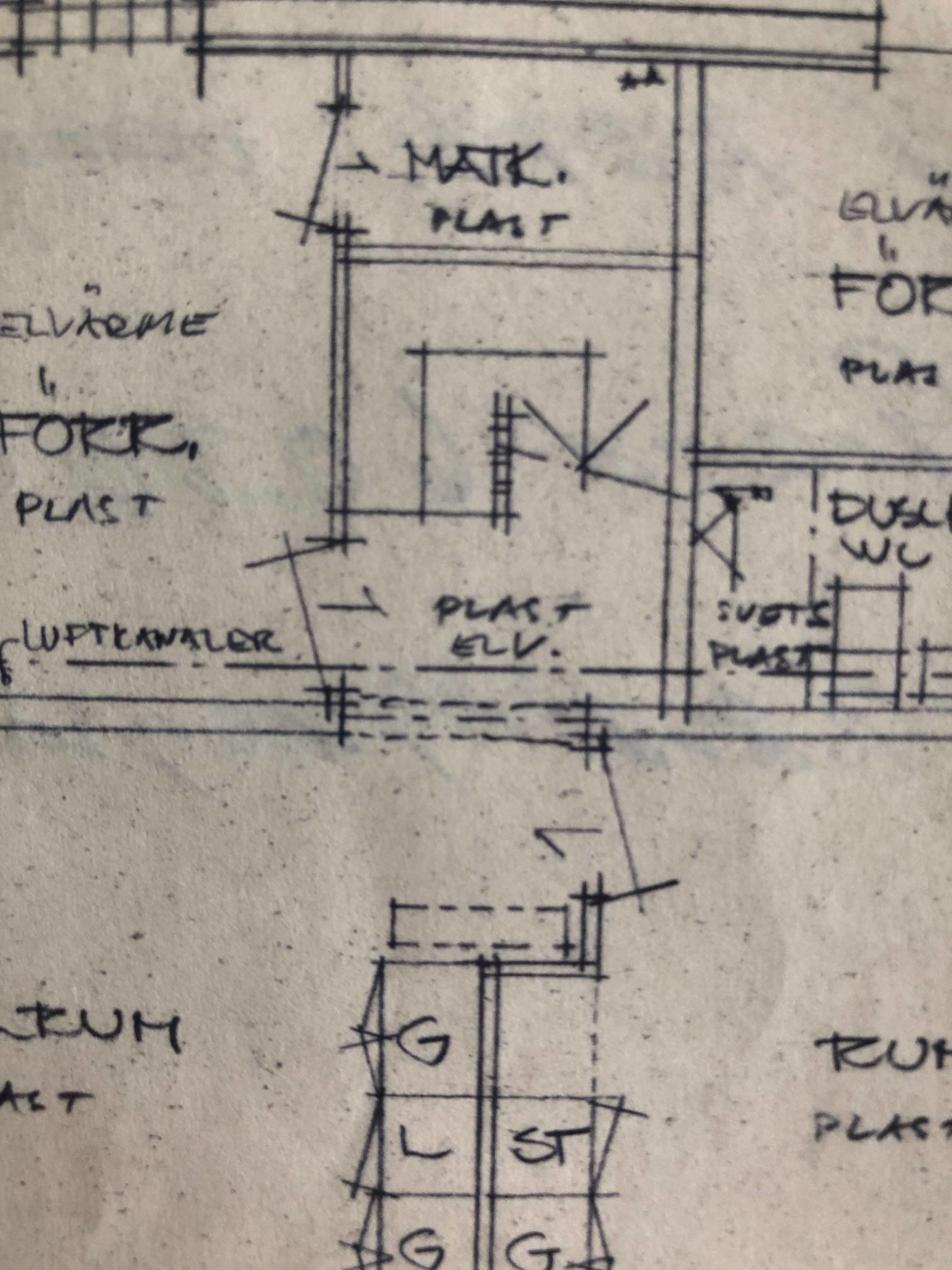 Har tagit bort lite till av väggen på höger sida, de tidigare ägarna snickrade upp en garderob under trappan, dörren intill höger är också borttagen. det är nog det som förvillar med ritningen.