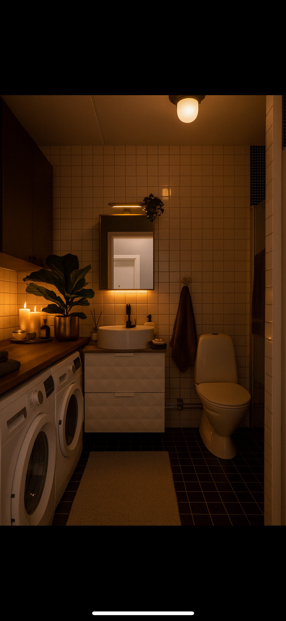 Textiler (matta, handdukar som syns inkl. litet lager), tvålflaska i någon färg som du gillar och (falska) växter/prydnadssaker på bänkskivan till vänster gör ju mycket för helhetsintrycket och är nog det billigaste. Då när den svart-vita stilen var populär för 15 år sen ungefär hade man ofta röda handdukar etc.