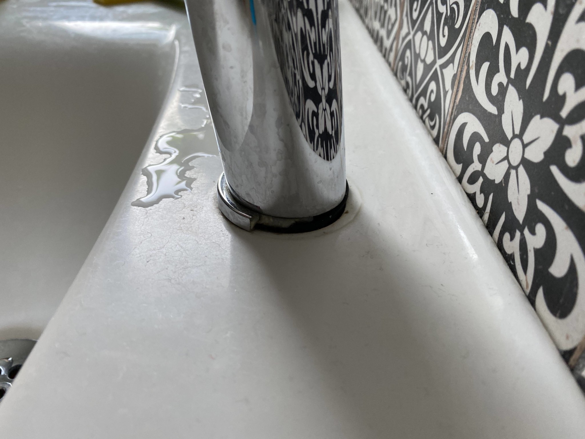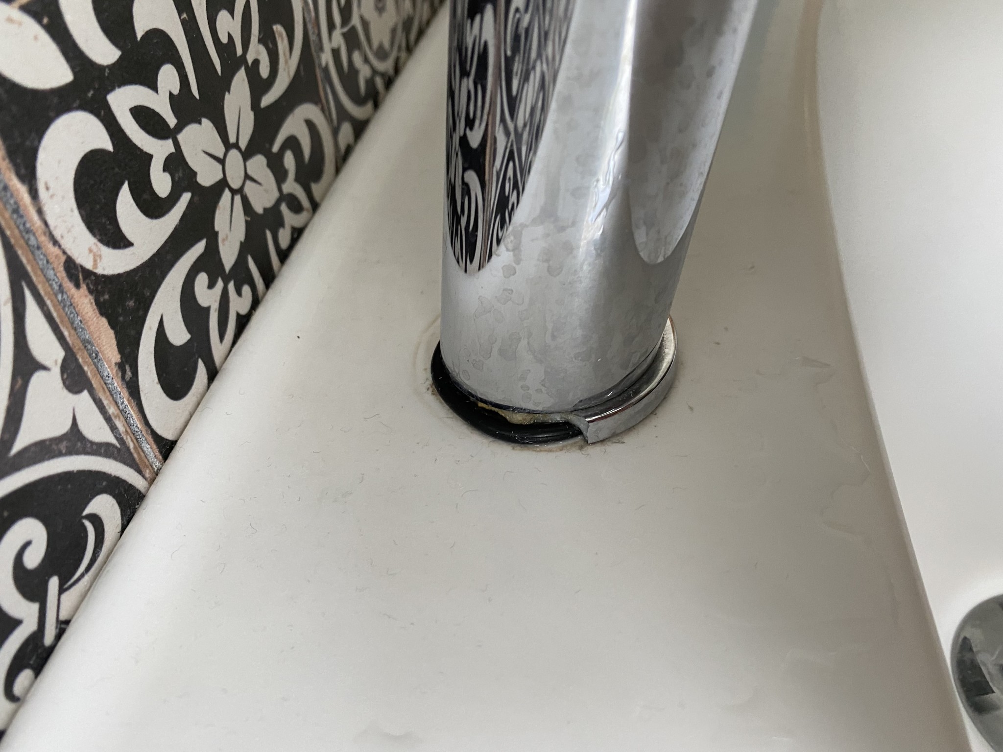 I vårt badrum sitter en liten ring vid kranen som sprack för ett tag sen och har därefter börjat bli mer och mer "vickbar" i samband med att bitarna från kranen har lossnat.