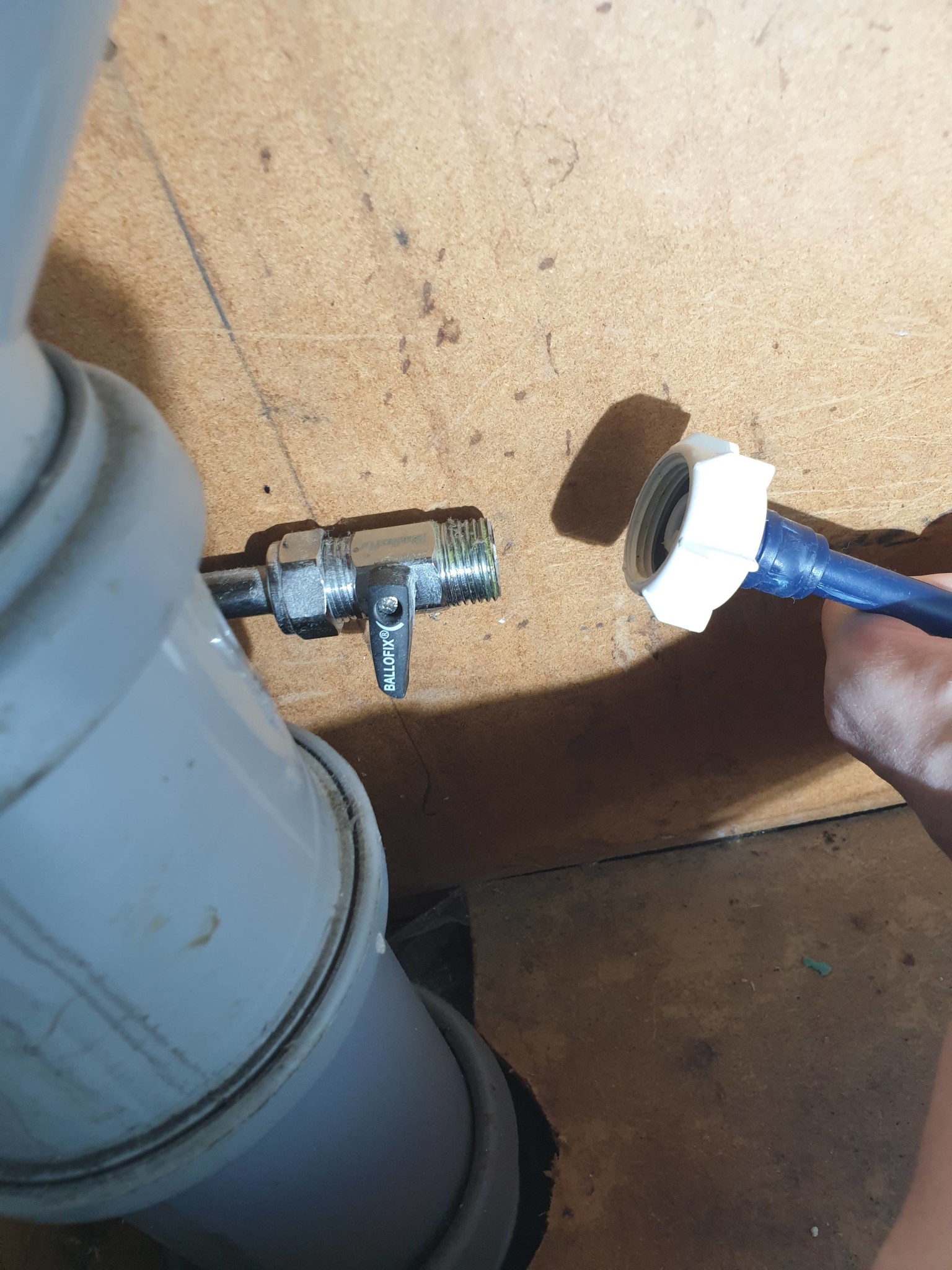 Du behöver antingen byta ut kulventilen eller sätta en bussning med lin och pasta. Du får mäta vad du har för storlekar på gängorna men gissar att kulventilen är R15, alltså ½”. På slangen är det antingen R20 eller 25.
