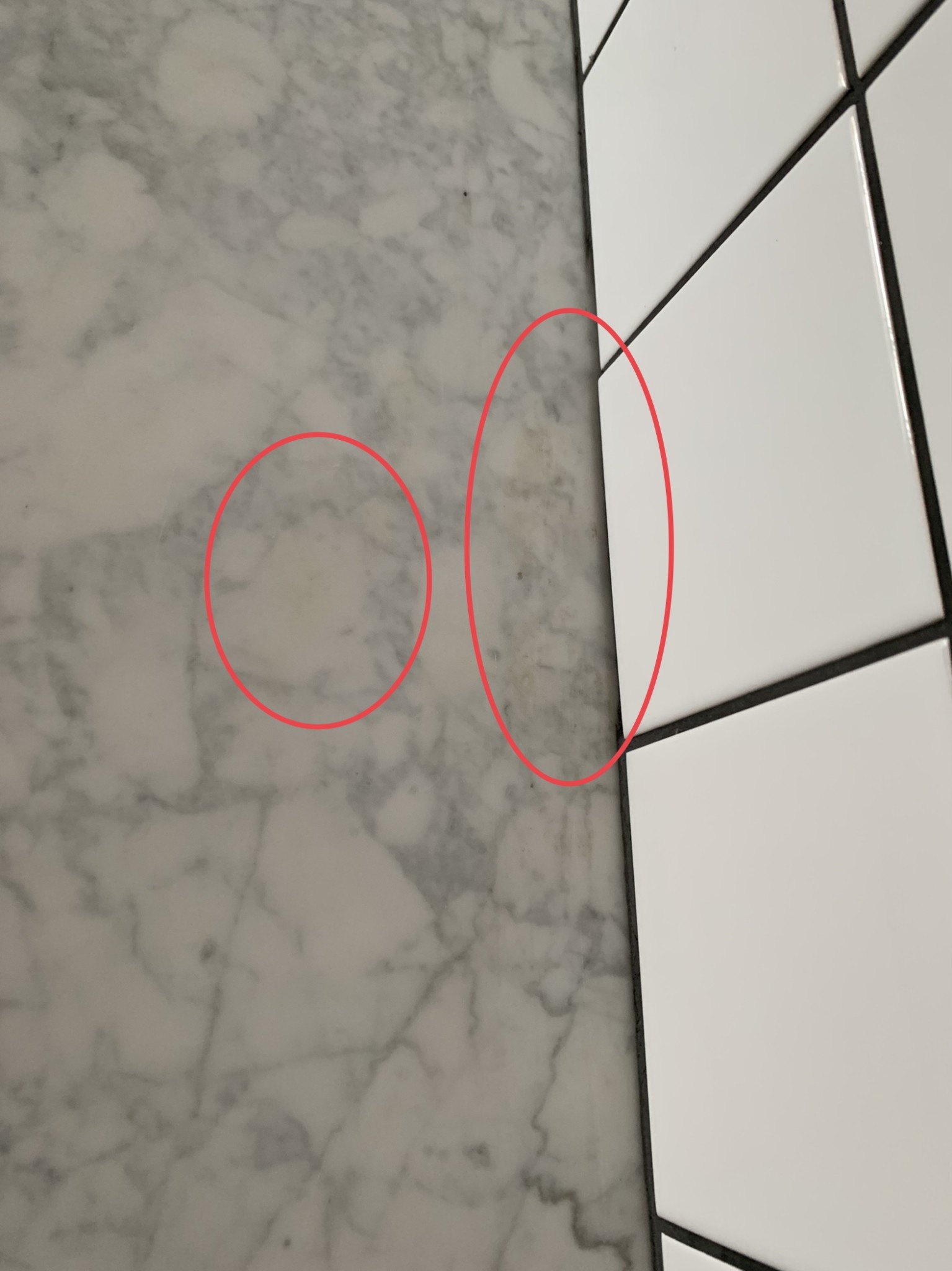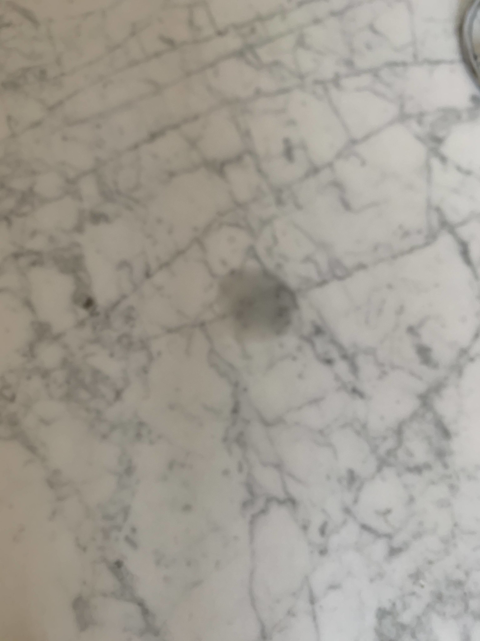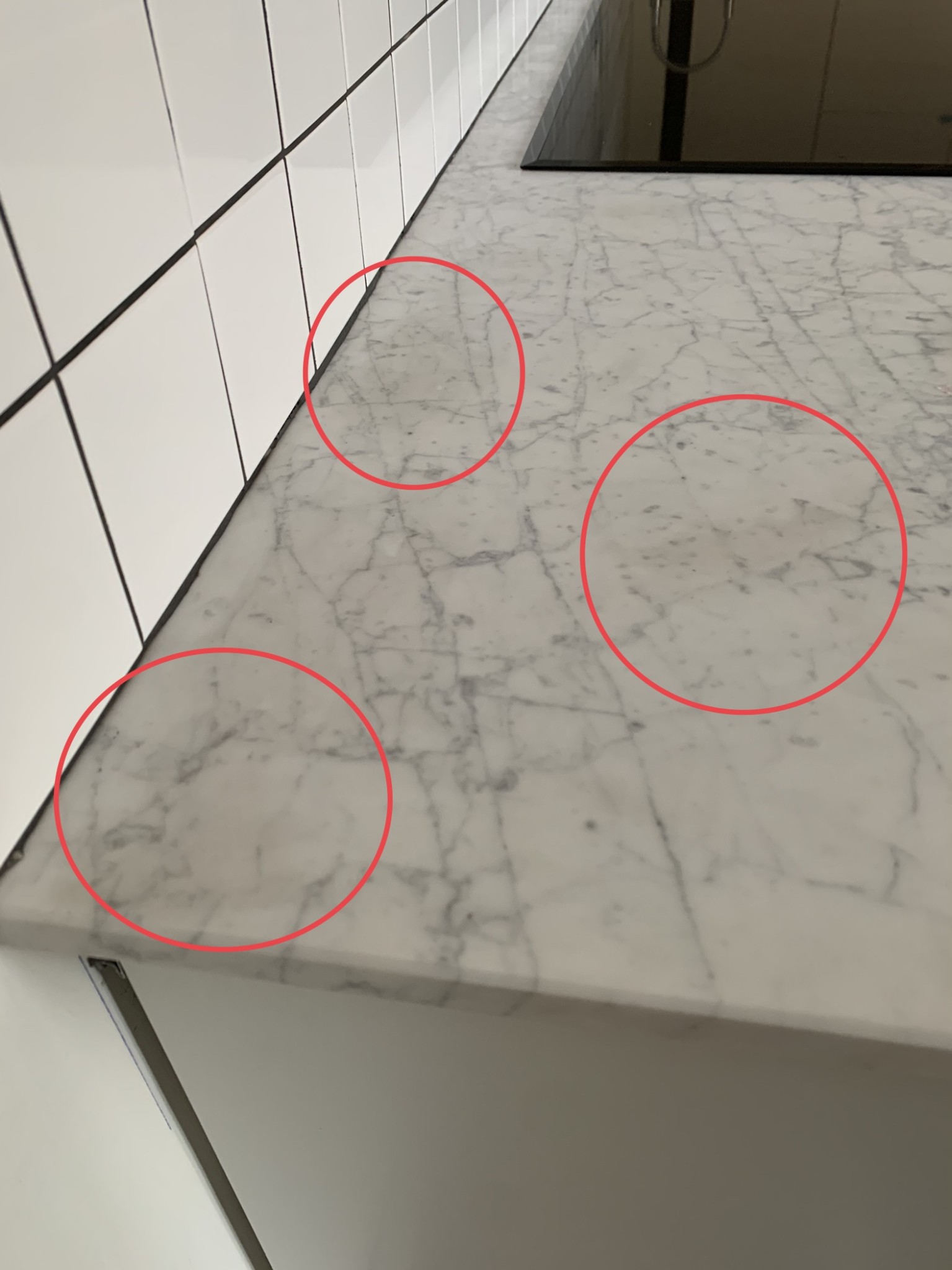 Men, med en Carrara bänkskiva så är detta bara början, inom några månader kommer du ha samma fläckar ändå överallt. Jag har haft en likadan skiva och den är omöjlig att hålla fin. Så till hantverkaren så kan du lägga fram det som att du verkligen är missnöjd och vill ha någon typ av ersättning, men enligt mig kommer du inte bry dig om 3 månader.
