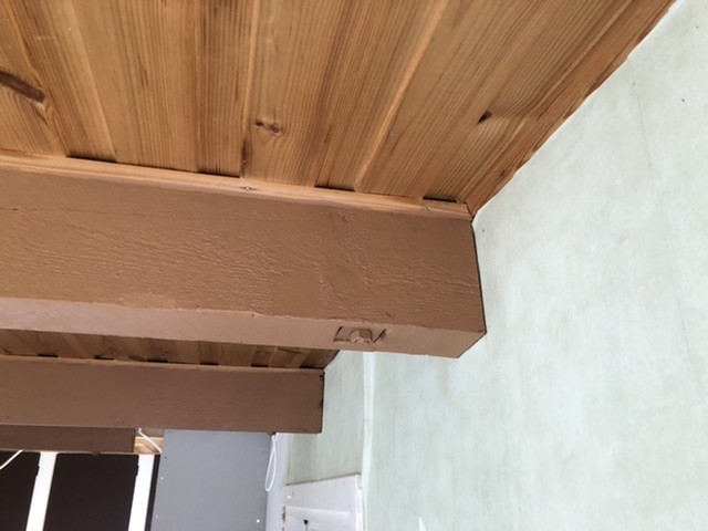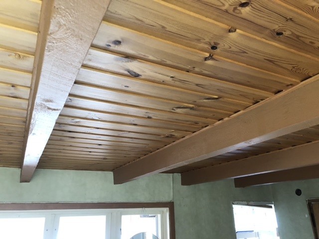 Och takpanelen har dold infästning och ligger rakt över rummet ovanpå bjälkarna, därmed ditsatta före dessa?