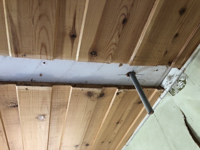Märklig lösning. Kan det vara så att takpanelen är spikad ner i dessa bjälkar? Att man gjort så här för att det tidigare vindbjälklaget börjat bukta ner och man vill ha ett plant innertak.