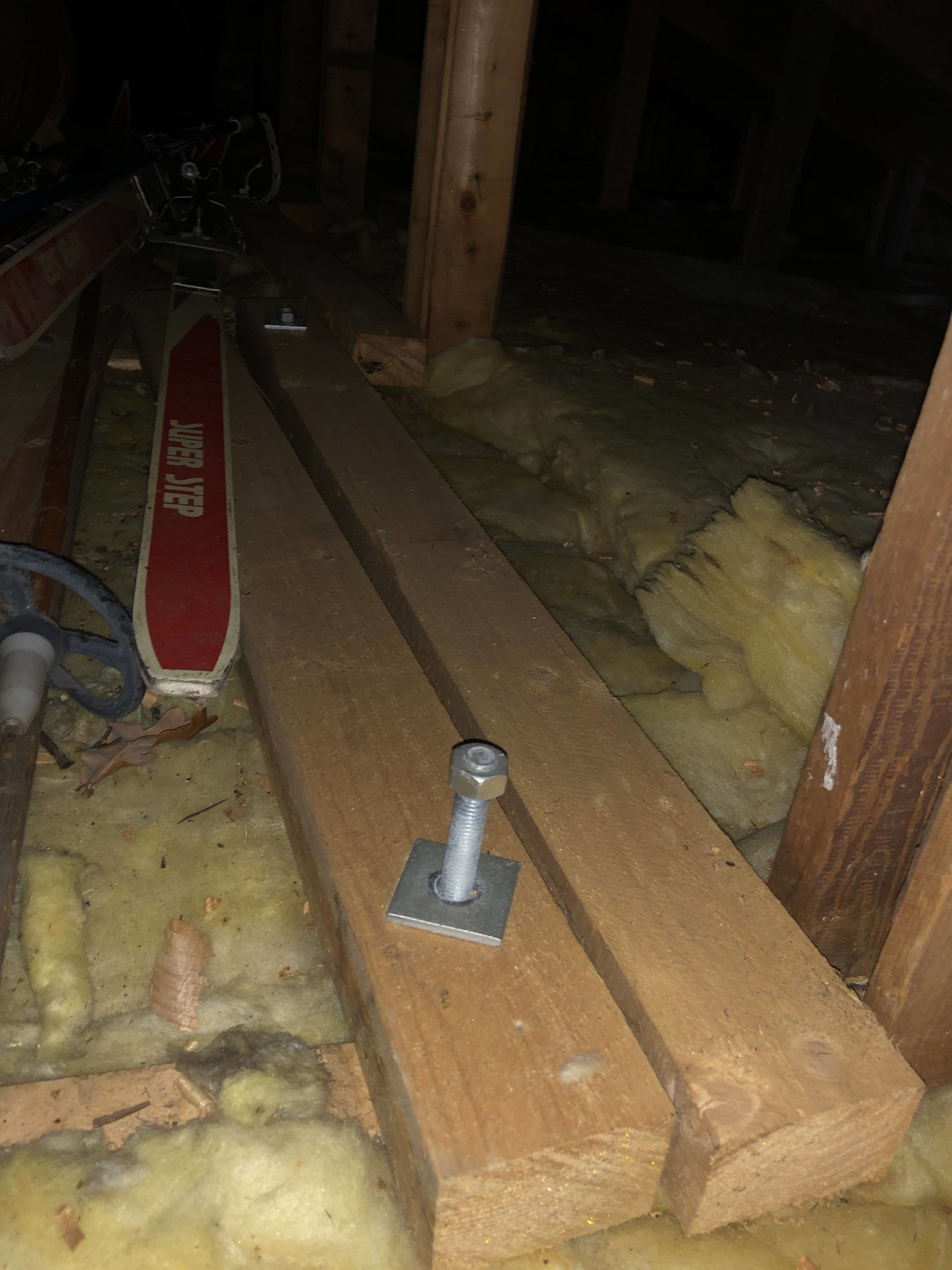 Varit uppe och tittat på vinden nu. Bultarna går upp genom undertaket och är fästa i reglar som ligger tvärs mellan takbjälkarna.