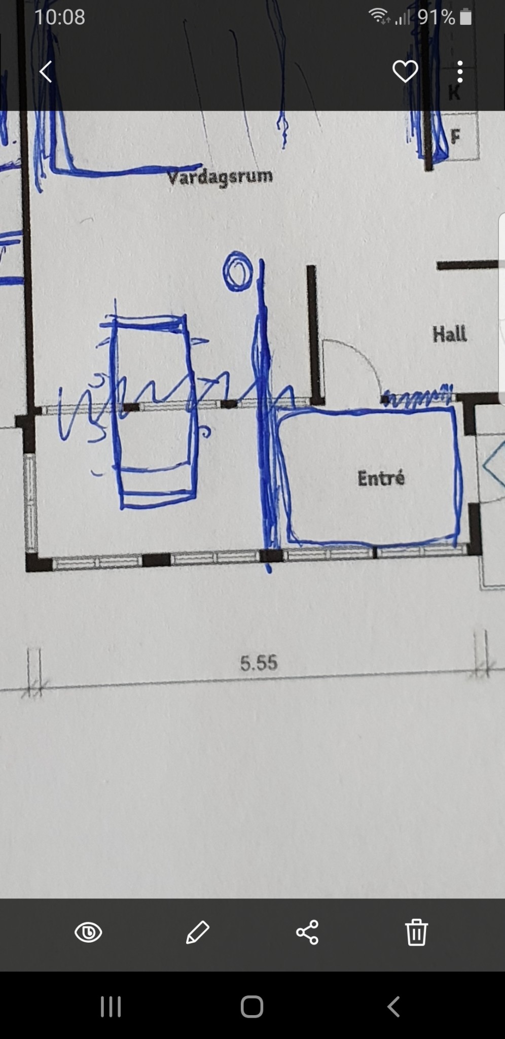 Det är ganska svårt att ge sig på en kvalificerad gissning utifrån din bild. Dels är det mycket kladd på den och sen går det inte att få någon helhetsuppfattning av husets planlösning och eventuella konstruktion.