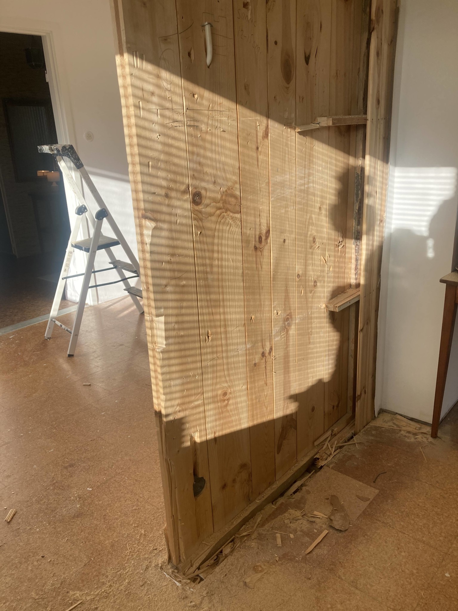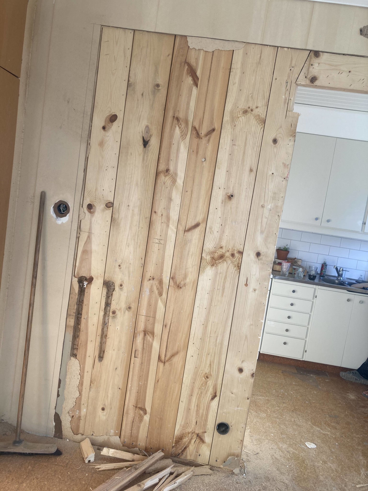 Har tidigare frågat här på forumet huruvida en vägg lär vara bärande eller inte. Tanken är att vi ska bredda öppningen med ca 1 meter. Anledningen att vi nu är osäkra är pga de tjocka spontade brädorna (45mm brädor) som hittades bakom masoniten. Så jag frågar igen, vad tror ni? Se bifogade bilder över ritning samt vägg.