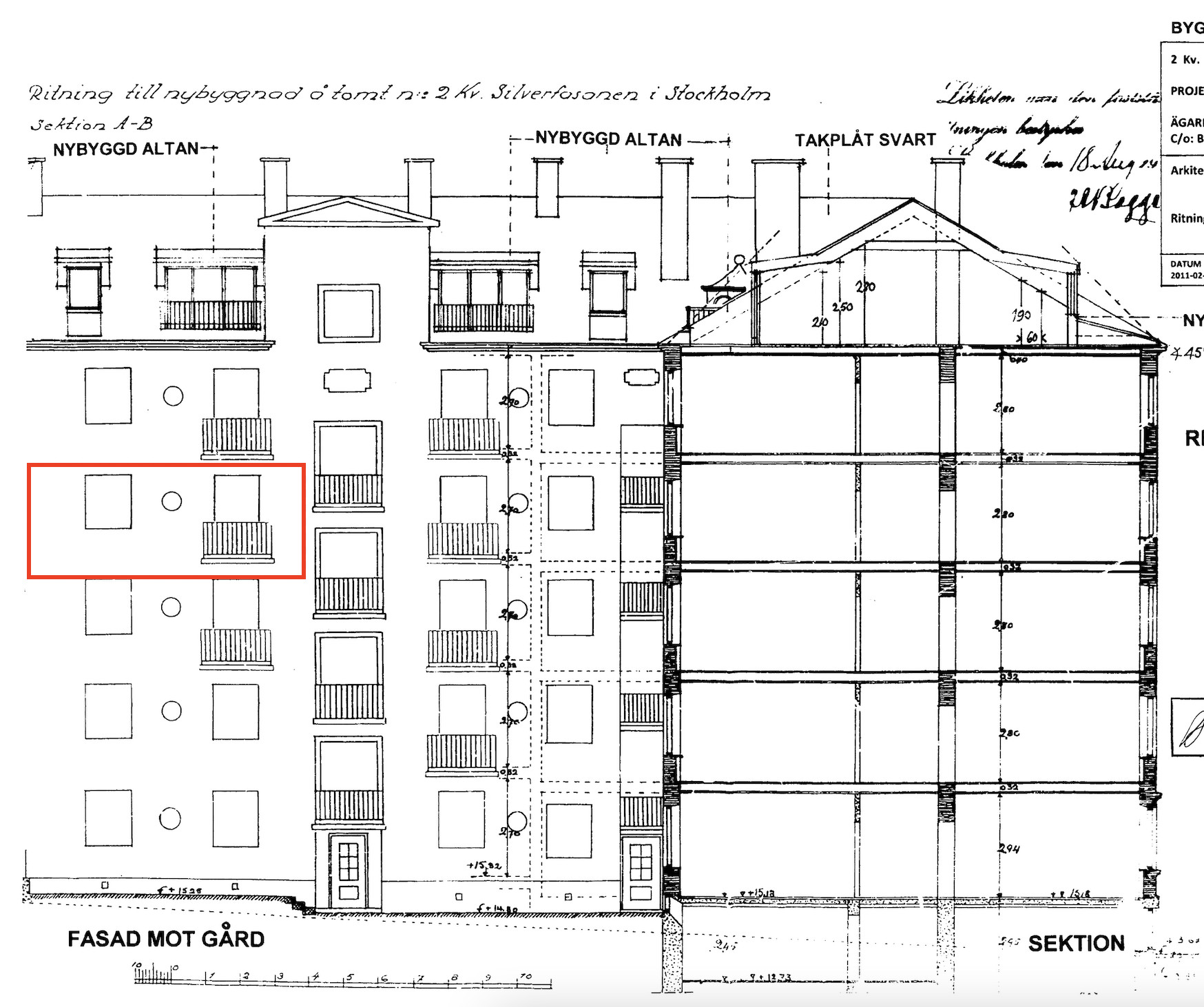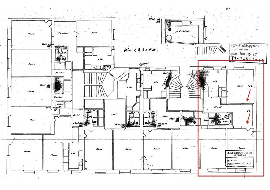 På ritningen "planritning vån 1-4 tr. med markering av vägg" har jag markerat båda väggarna. Det är framför allt V2 vi funderar över huruvida den är bärande eller inte. Lägger även upp konstruktionsritningar för huset. Huset är från 1927 och lägenheten är på 3e våningen.