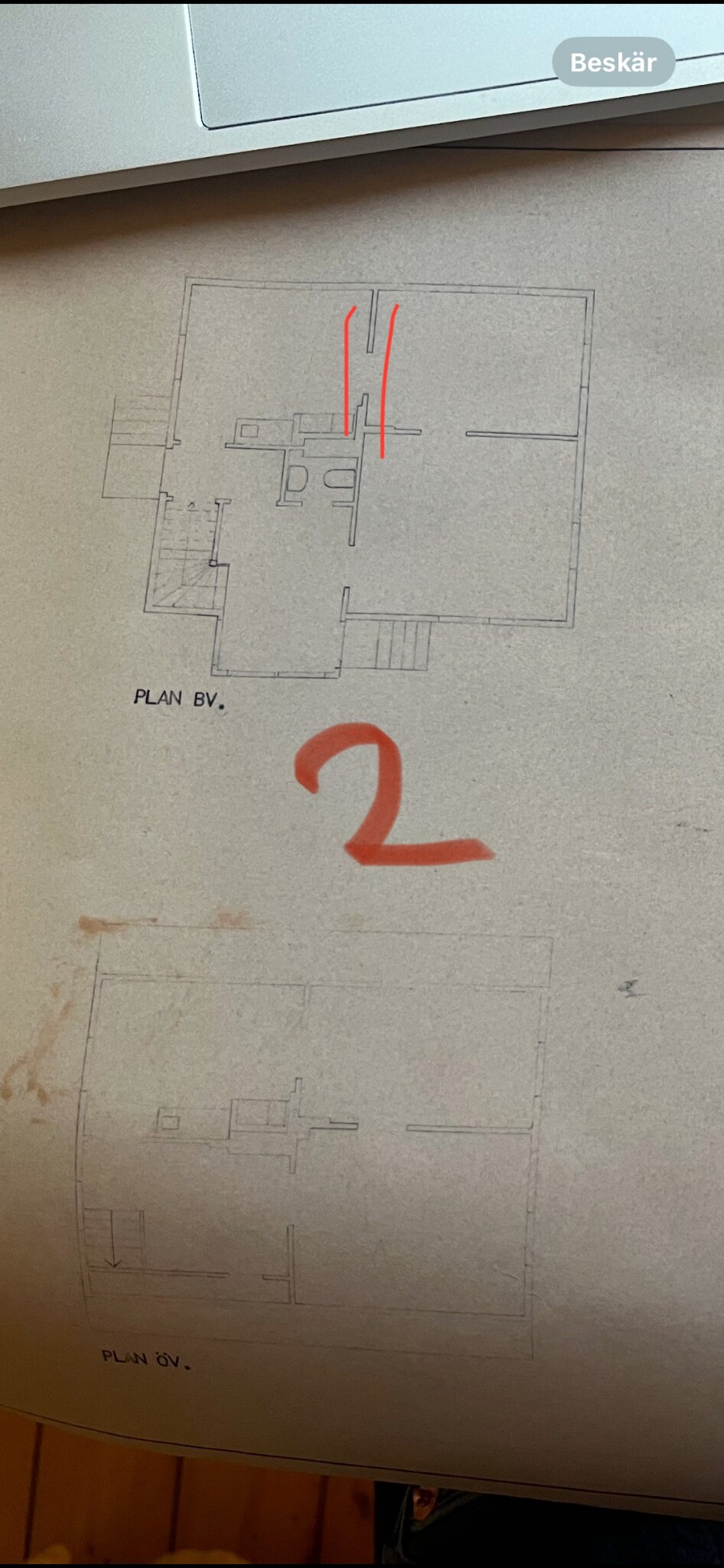 Behöver er hjälp/åsikt om denna vägg är bärande? Se ritningar. Bild 1 är hur planritningen ser ut i nuläget, den markerade väggen vill vi riva. Är den bärande? Finns även alternativ ritningar på huset, se bild 2, Byggt 1932