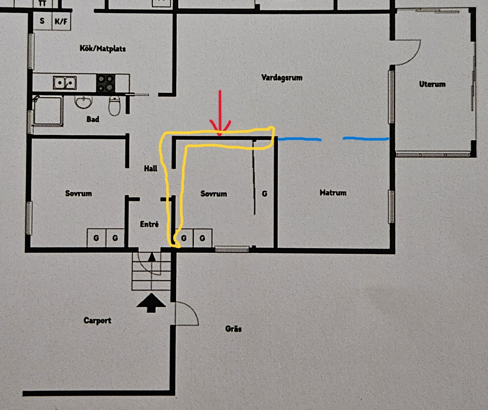 (Det som är "blått" vill jag lägga ny vägg för att få ett rum där.)