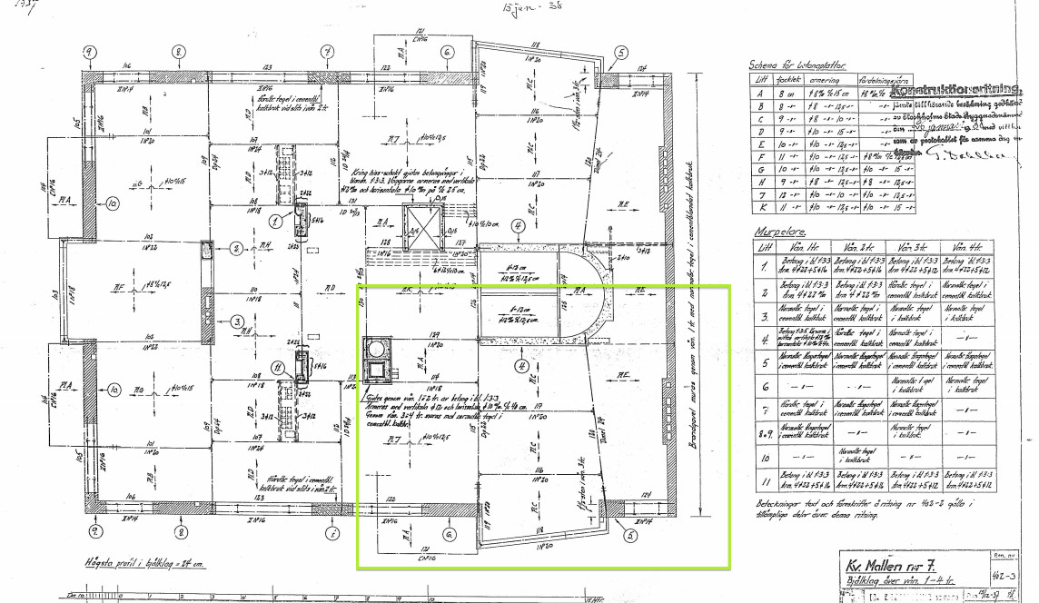 Det känns däremot som att den inte kan vara bärande då väggarna inte ens finns med på originalritningen längs ned. Väggarna verkar inte ens stå under någon balk. Fast en bärande vägg kanske kan vara konstruerad att lyfta betongplattorna mellan balkarna?