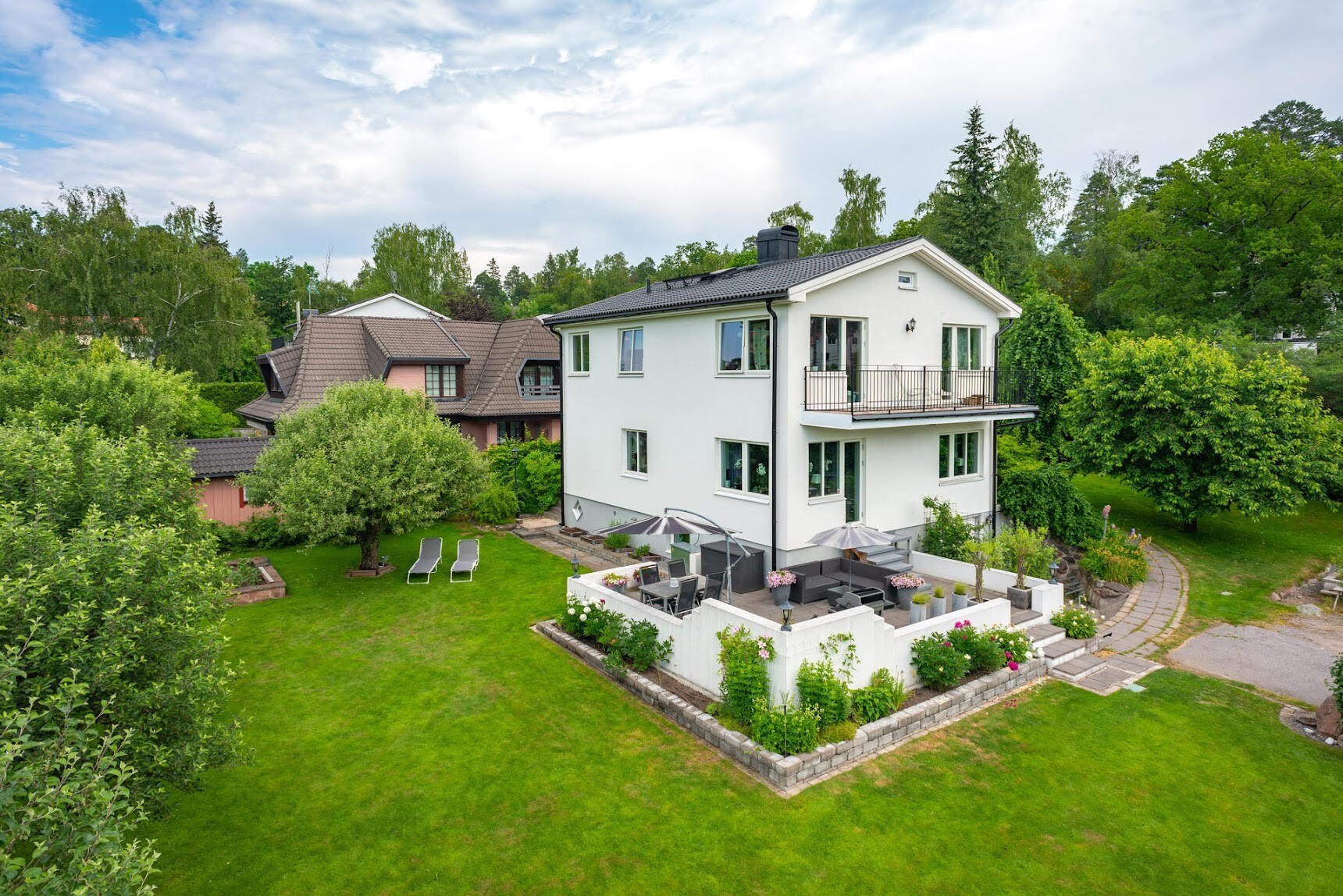 Huset är en putsvilla från 1935 med öppna spisar på varje plan och rökkanal som går igenom murstocken.