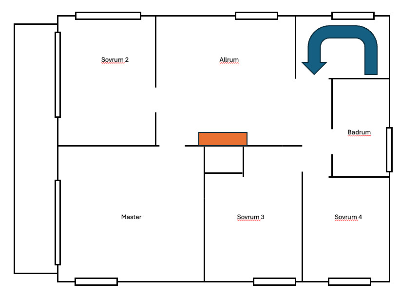 Jag skulle vilja förstå vilka väggar som är bärande i mitt hus på plan ett (övervåning). Framförallt skulle jag vilja veta ifall väggarna runt den öppna spisen, markerat i rött i bilden, är bärande. Det vill säga de två lite tjockare väggarna runt murstocken på ritningen som går ut som ett V runt öppna spisen. I verkligheten är inte de väggarna tjockare eller smalare än övriga väggar på våningsplanet, cirka 10 cm. Det känns annars som att alla väggar är rätt robusta förutom väggen mellan "kök" och "sovrum" där man känner att det är i princip gipsvägg.