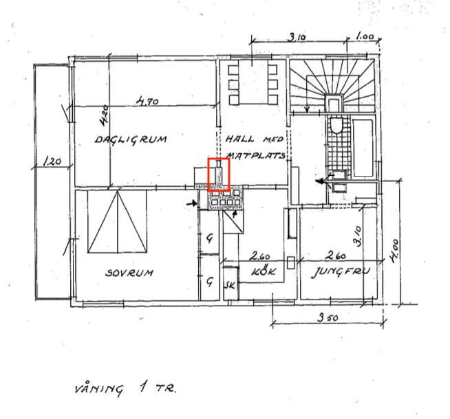 Den kan vara bärande om det står en 1/2 takstol på den pga murstockenC Chrzan skrev:Ja, det är för att ange att de är murade som de är skrafferade på ritningen (och tjockare av naturliga skäl). Din gissning att det är för att ge obrännbara ytor bakom/kring resp. eldstad är den mest sannolika - så ser det ju även ut på entréplanet, där en murstump i samma läge dessutom ingick i (den murade) f.d. kylrumsväggen. De "för-förra" har redan härjat rät kraftigt med väggdelar kring skorstensstocken: rivit det mesta av kylrumsväggarna, avväxlat en öppning i den bärande hjärtväggen in mot köket för en nisch med två högskåp, och...uppenbart rivit den väggdel, som står rakt under den du vill riva.
