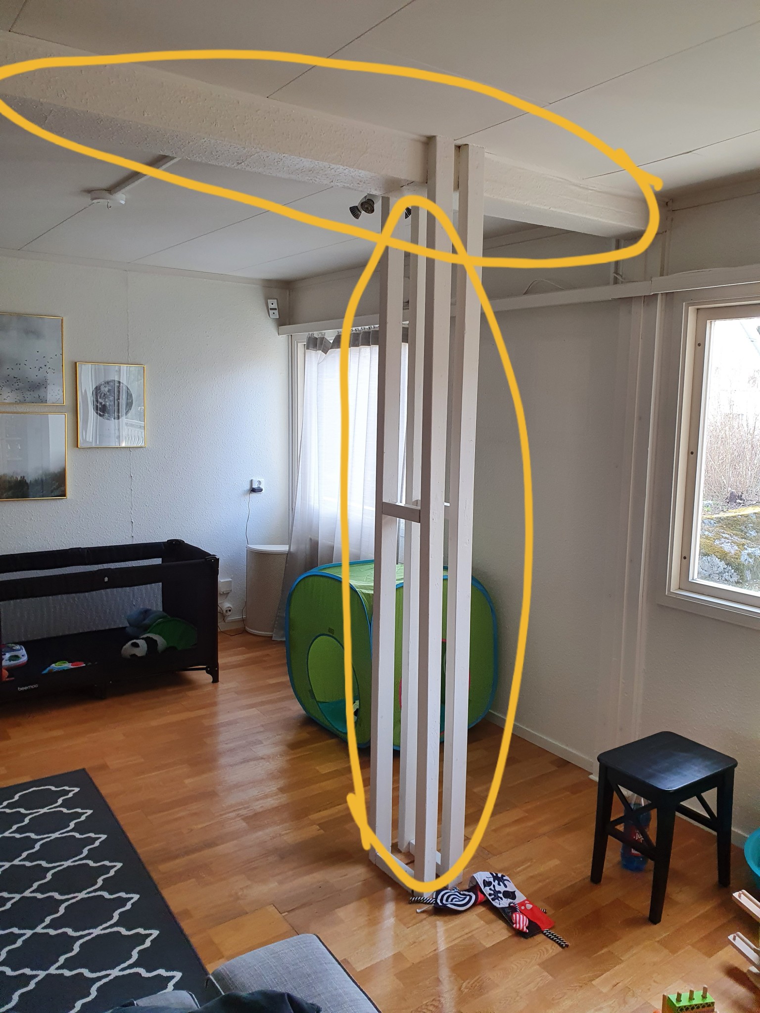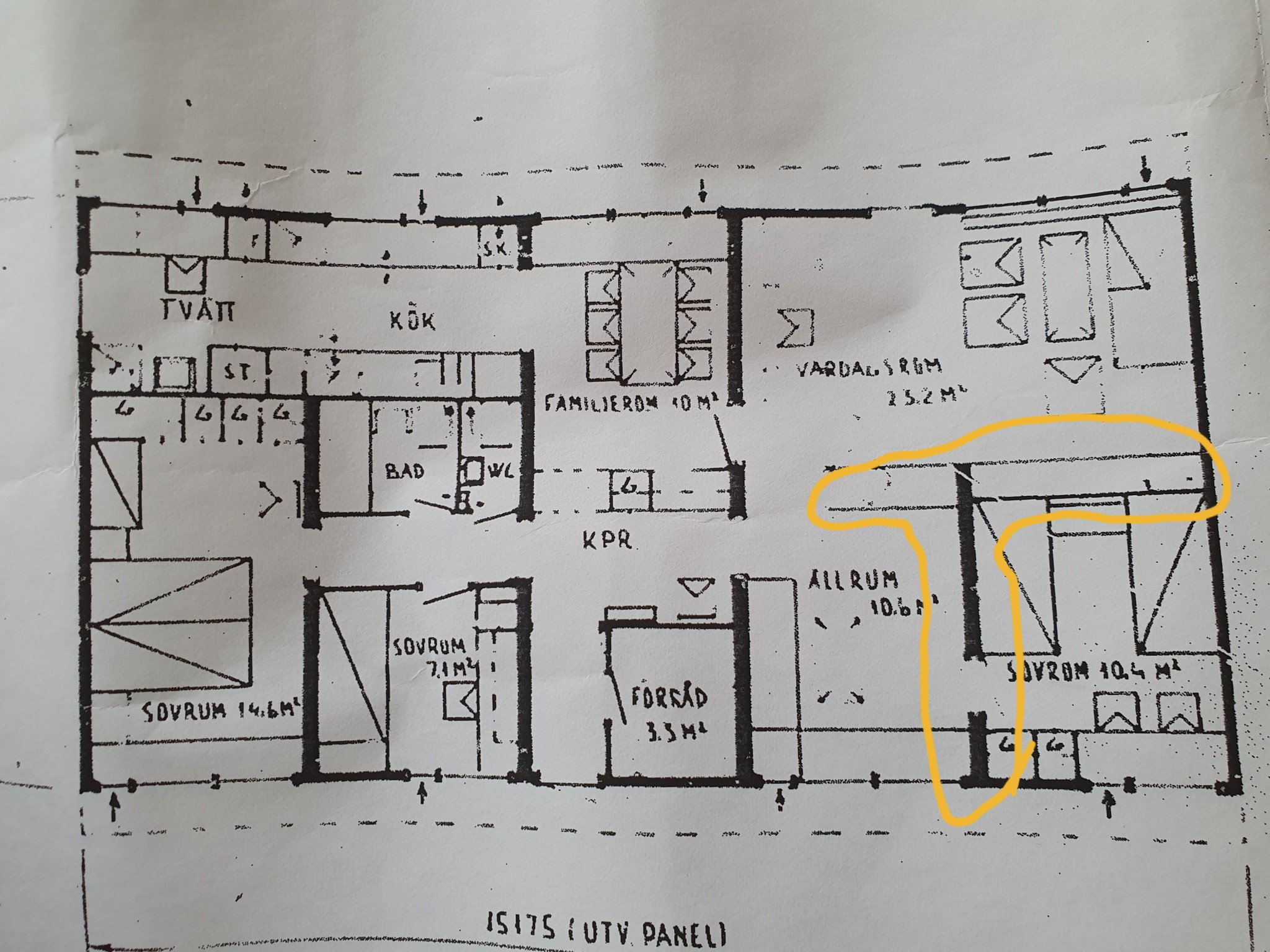 Finns någon vönlig själv som kan se på ritning om det markerade oranga området kan tänkas vara bärande? Alternativt var kan man vända sig för att kolla om väggarna är bärande. I vardagsrummet (inkl det markerade området) har det slagita ut väggar. Just nu verkar det vara en balk om något slag i vardagsrummet som låter ihåligt när man knackar på det. Samt två "pelare" i endera sida av vardagsrummet. Det har en viss böjning också så vill undersöka om vi behöver sätta tillbaka väggarna enl ritning.