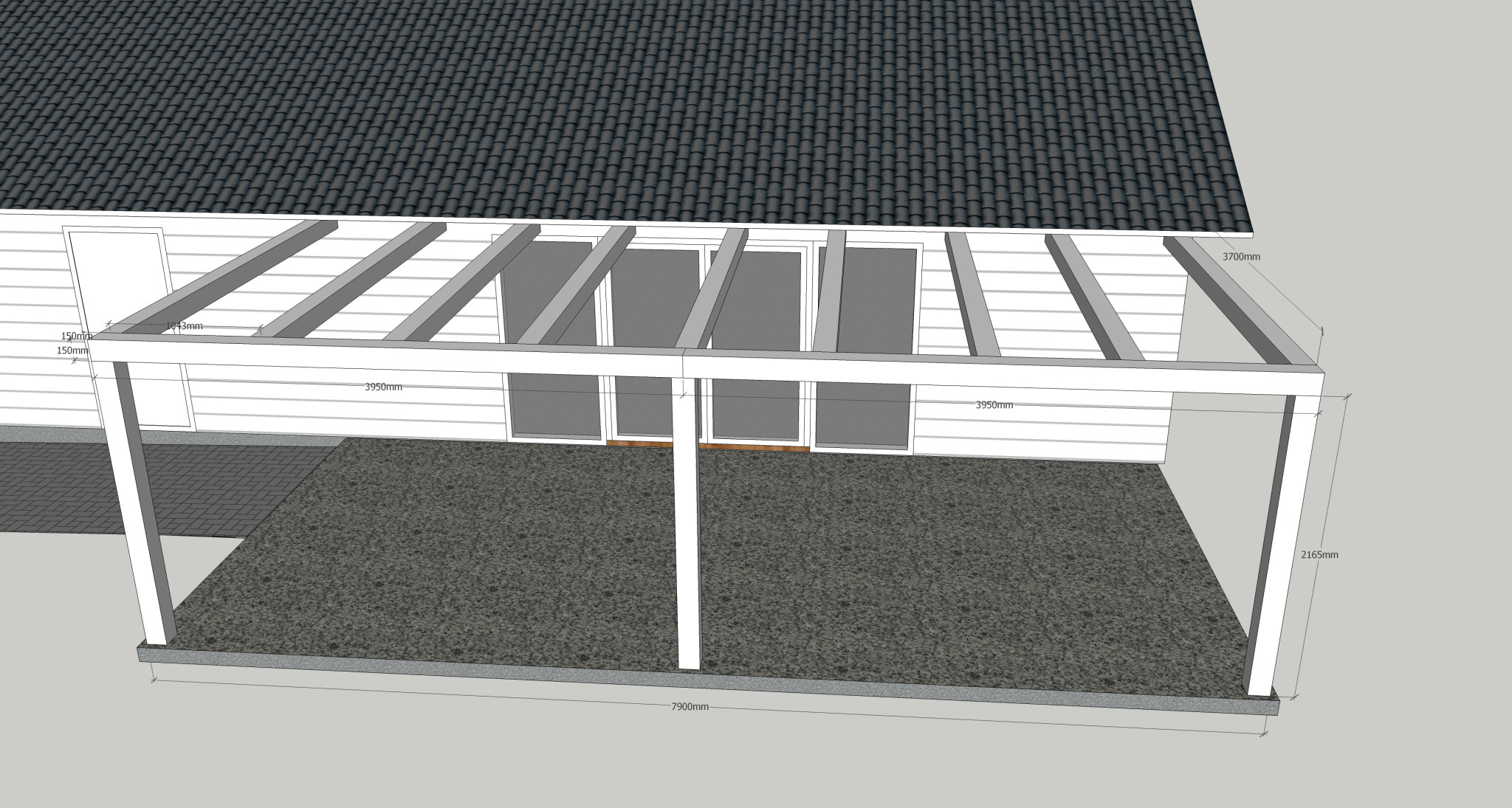 Designmässigt tycker jag det vore snyggt med virke med kvadratiskt tvärsnitt. Problemet är att man inte utnyttjar materialet särsklt effektivt på det sättet. På en täckt del fungerar det bra med 150x150 virke som takbjälkar, däremot är det för klent som bärlina i framkanten. Antingen får du sätta en stolpe till i mitten eller gå upp i dimension, t.ex. till 165x315.
