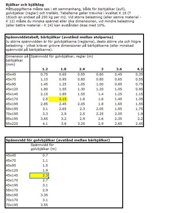 Jag håller med @justusandersson ANVÄND INTE DEN DÄR TABELLEN! Jag har byggt en altan efter den där tabellen och det är markant svikt i bjölklaget.