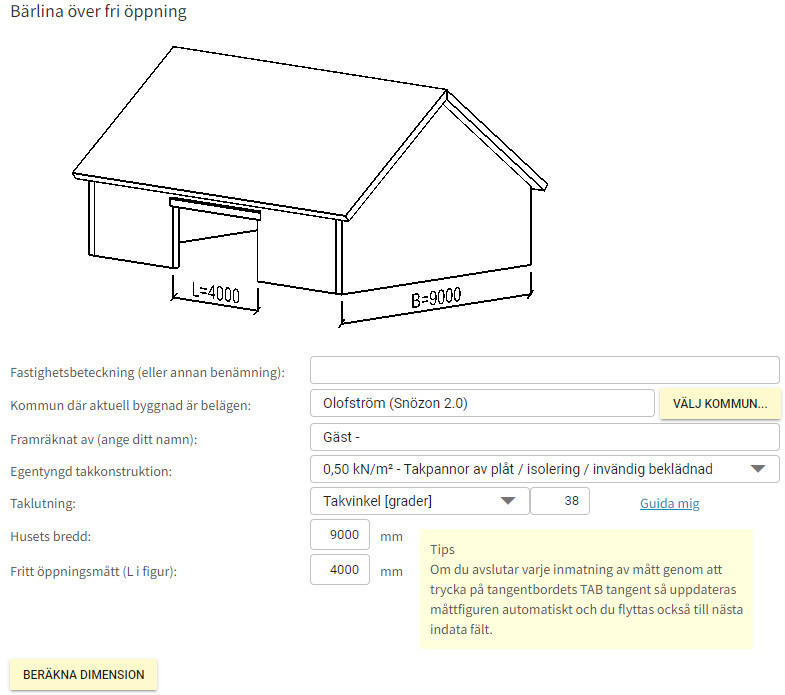 Om jag tar de värden du visar ovan, mått, snözon och takvinkel så blir lasten i varje pelare på vardera sida om porten 30,061 kN enligt byggbeskrivningar.se