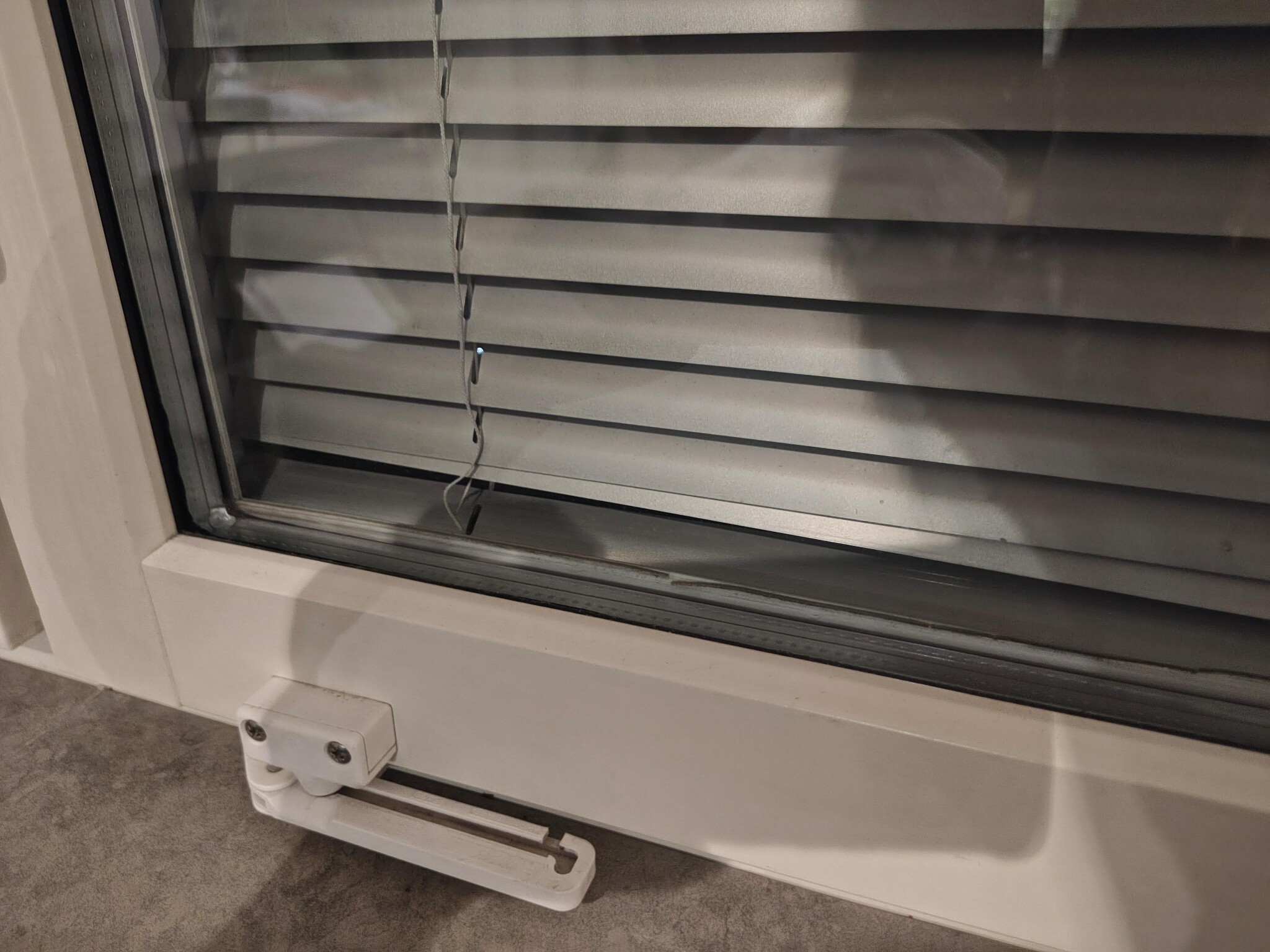 Persienner som är inbyggda i fönster har släppt på ena sidan. Bifogar två bilden där detta syns.