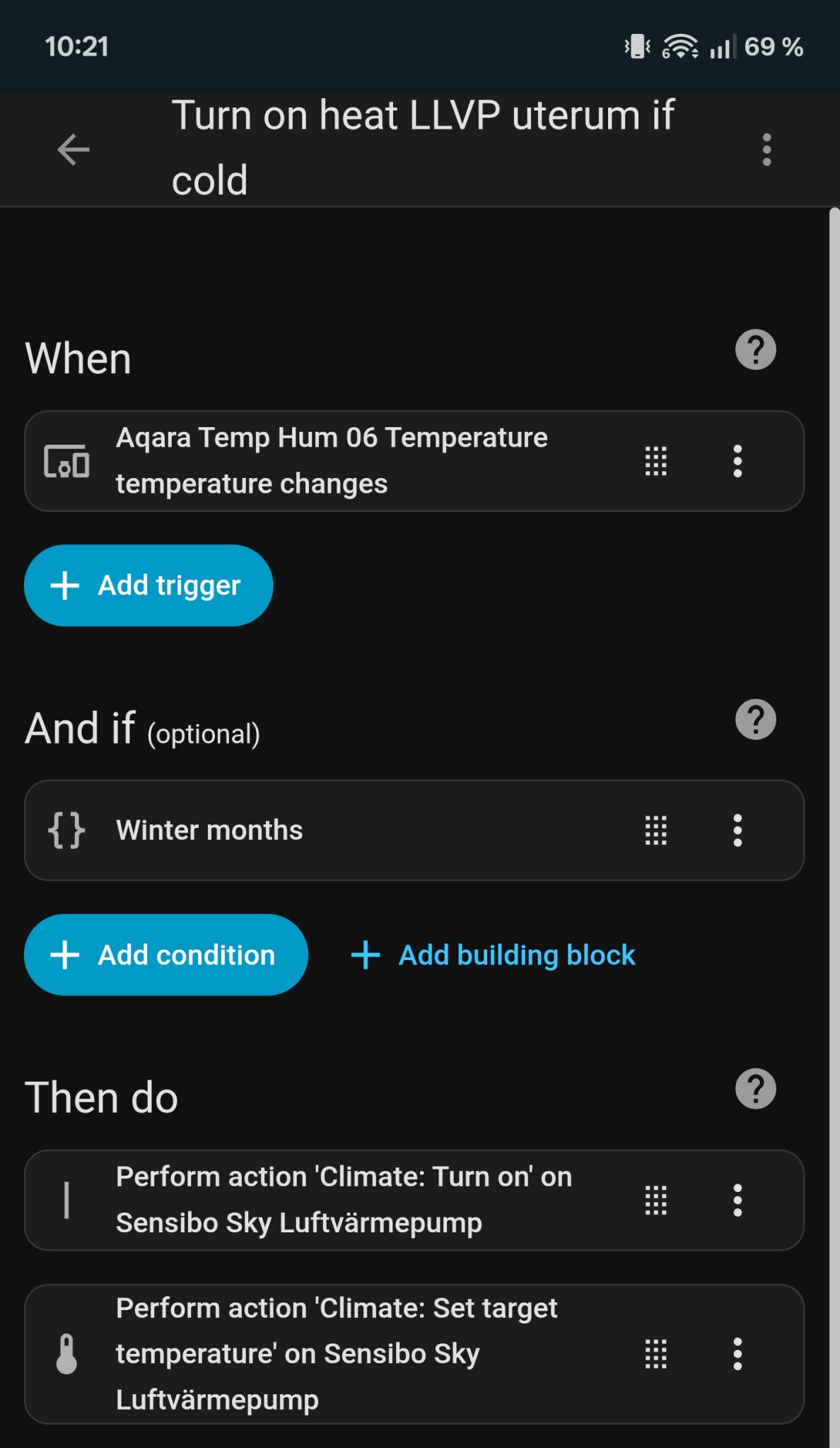 Som exempel då så styr jag vår i uterummet med temperatur. Men det finns inget som hindrar en för att trigga på tid, elpris, rörelsesensor eller när posten dimper ner i postlådan. 😉sy97jgu skrev: