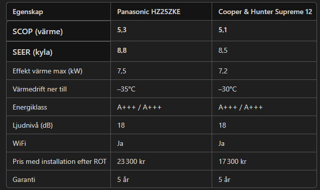 Kolla bara på följande jämförelsen i bilden jag bifogat. Jag säljer båda dessa modeller och förespråkar inte i sig ena eller andra här i forumet utan det ska vara efter behov men det är värt att reflektera här kring prisskillnaden och vad man får i prestanda kontra den tiden att få 6000 kr tillbaka speciellt om man bor på lite sydligare parter av Sverige där vinterkylan sällan hamnar under -15 grader.