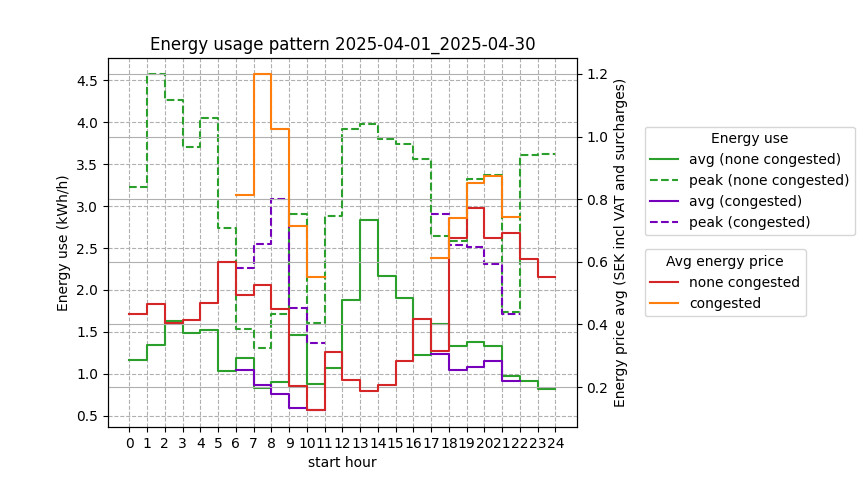 April var första månaden med förbättrad styrning av varmvattenet. 930kWh till huset (exkl bil) fördelade sig såhär gynnsamt för timpris (tar hänsyn till effekttaxa):