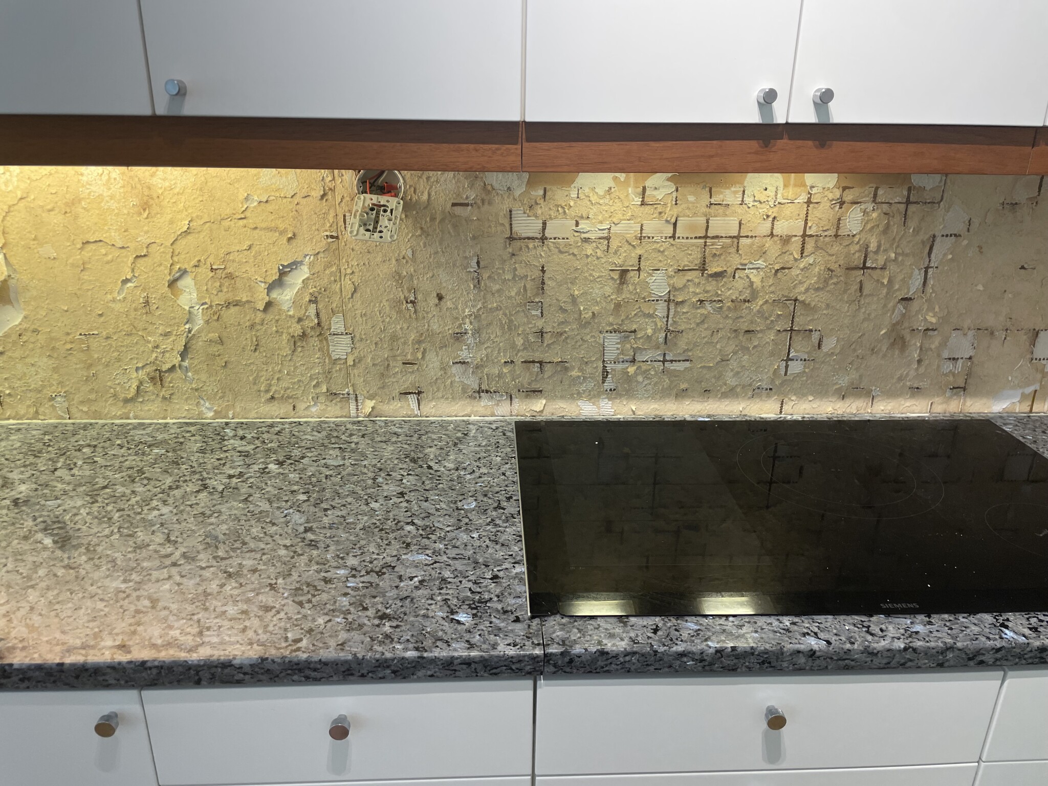 Efter, som stänkskydd vill vi sätta en 10-15cm blågranit sten/klinker (som i bänkskivan) och resten av väggen måla.
