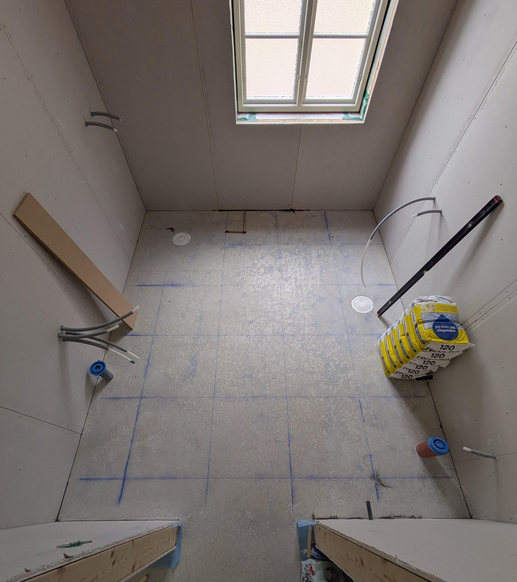 Ska snart ta mig an vanvettsaffären att göra våra badrum. Vi har valt stora klinkerplattor, 600x600 bortsett från duschhörnorna som är 300x300 mosaikplattor. Badrummet har två golvbrunnar.