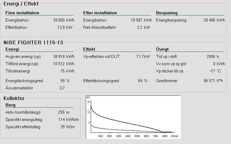 Vi gör idag av med 36 m3 travad ved + ca 10 000 kWh el till elpatroner. (Om man räknar med att vi gör av med ca 5000 kWh i hushållsel). Är det dessa siffror du bygger din beräkning på när du uppger ett nettobehov på 39 000 kWh? Det vore intressant att veta!