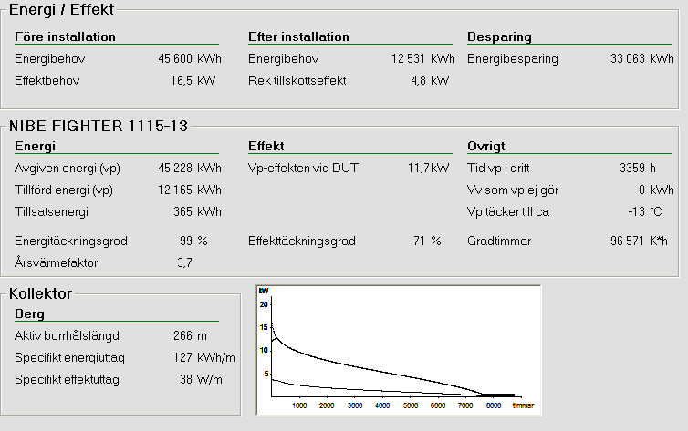 Man bör inte dimensionera berg för mer än 40 w/m sen kan man ju dimensionera med kortare hål högre efektuttag per meter men detta resulterar i minusgrader in under längre perioder av kyla och då sänker man effekten på varma sidan när man så väl behöver den. Hålet i frågan är dimensionerat för 0 grader in brine medel.