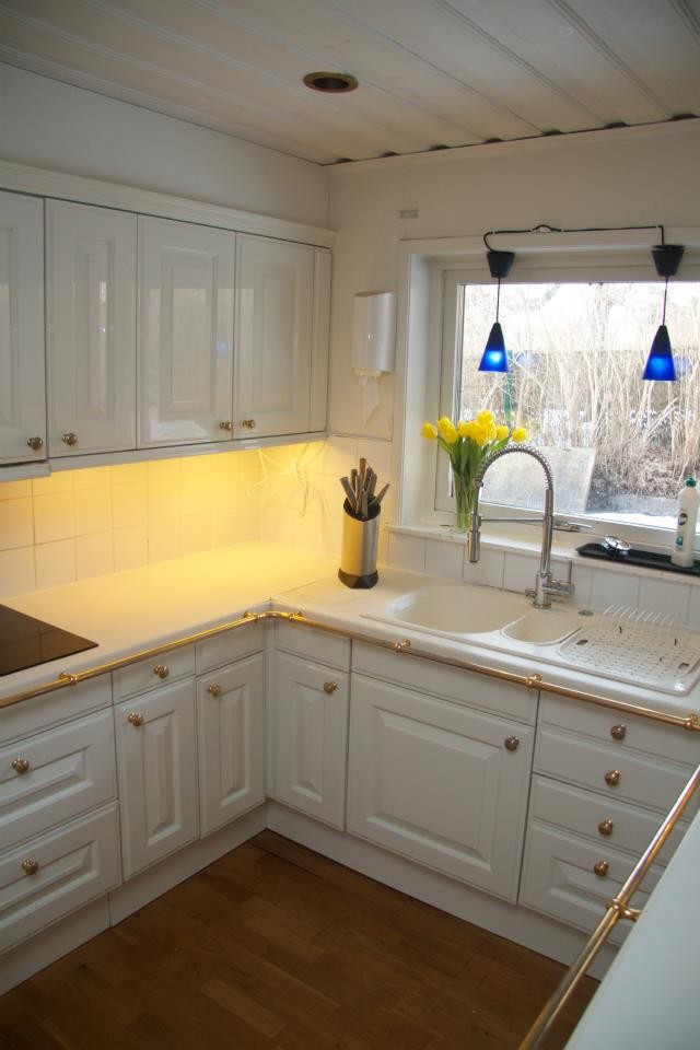 Köket är utrustat med reling i mässing. Knoppar på luckorna är också mässing.