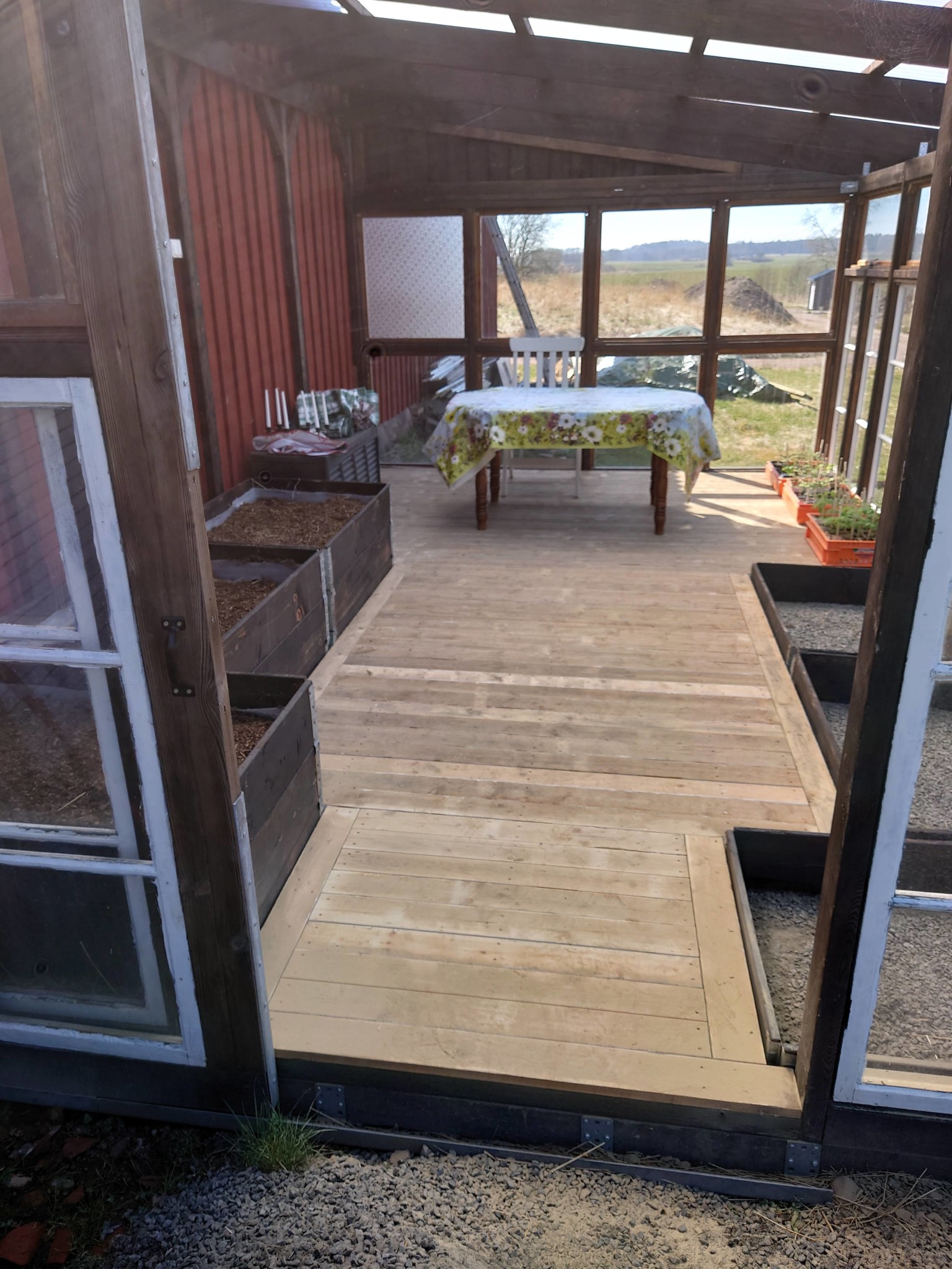 Har återbrukat en gammal ytterpanel som lagts som golv i ett växthus, håller på och slipa detta.