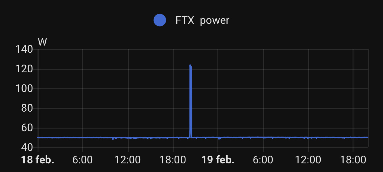 Nu har vi inte bestämt oss om det blir F eller FTX, men sannolikt FTX. F och FTX (utan eftervärme) drar kanske 200-300W. FTX med eftervärme drar kanske 1200-1500W.