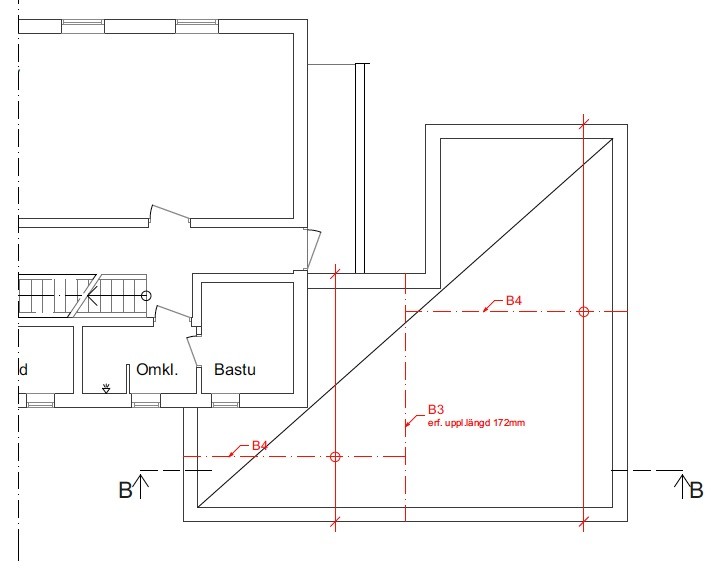 Rödstreckade linjer markerar balktyp och den heldragna röda linjen markerar dess utbredning, dvs. den typen av balkar skall ligga där över hela ytan… Svårare än så var det inte. tack för att du tog dig tid!