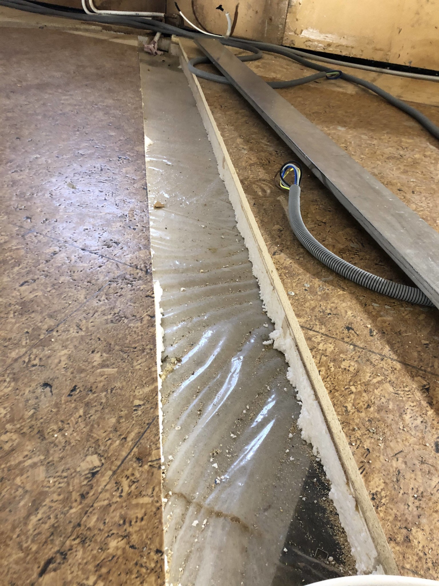 Ovanpå plattan ligger 50 mm isolering och därefter en spånskiva på ca 25 mm, vilket gör att jag har 75 mm att spela på för att få ett fall utan att bila.