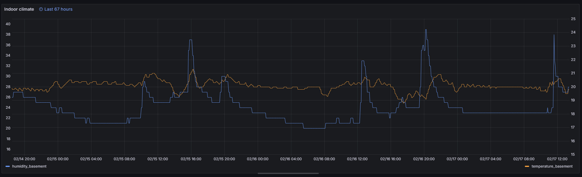 Huset står rätt högt, marken sluttar ner runt om och jag har inga problem med fukt i källaren direkt, långtidsmätning visar rätt stabil nivå runt 25-30% förutom spikar när torkskåp/torktumlare kört. Vi kör rätt varmt i källaren så det kanske hjälper.