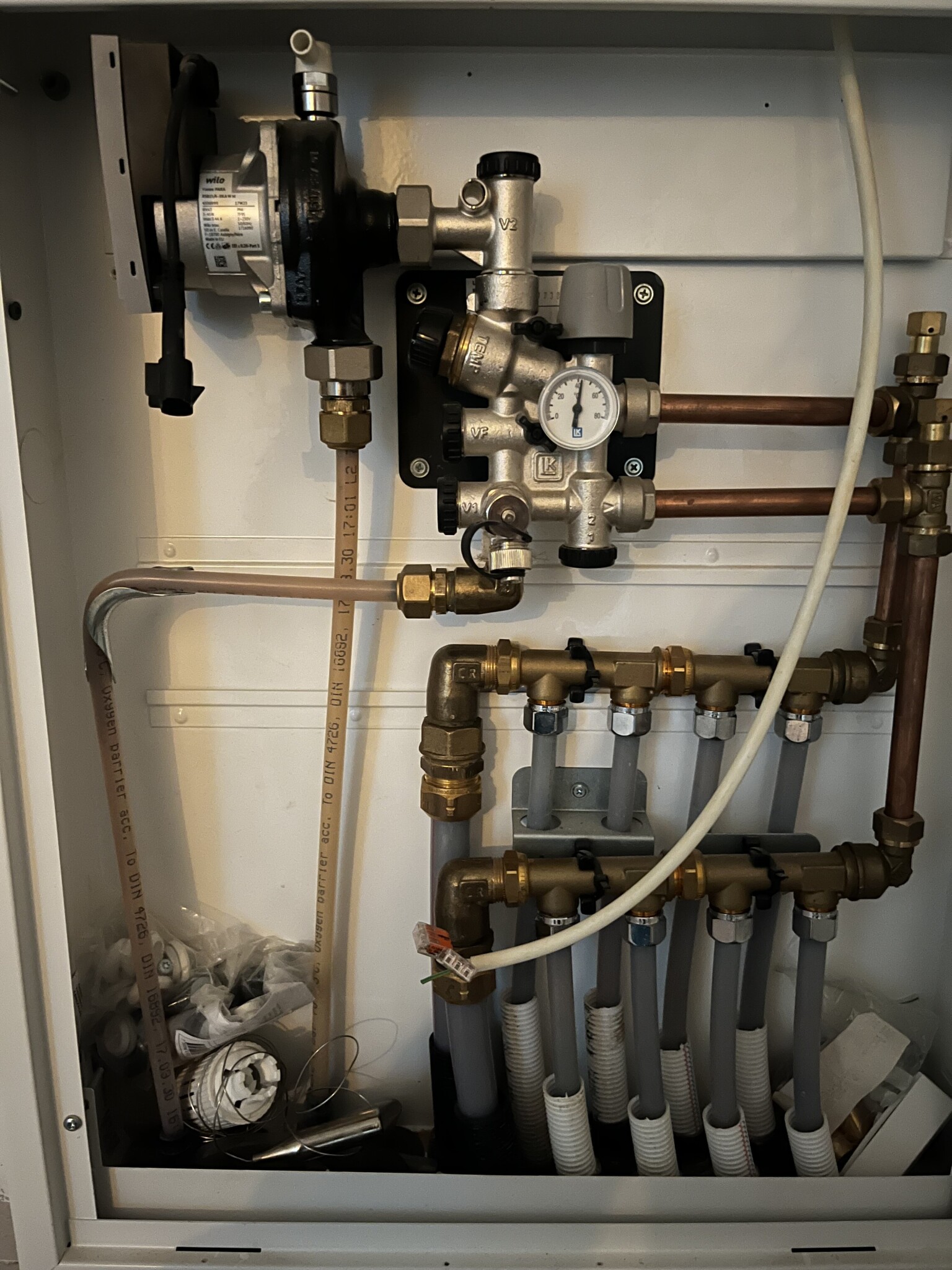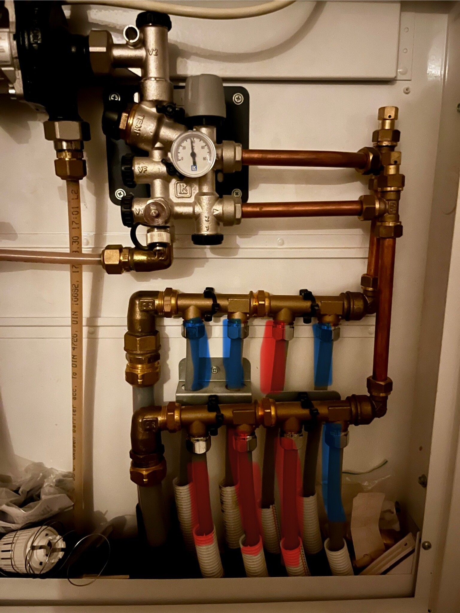 Otroligt tacksam för all respons. liten uppdatering, radiatorerna är luftade, systemet är påfyllt (låg på 0,7 är nu på 1,2bar), termostatventilerna kollade. Fortfarande bara 1 av 4 radiatorer som blir varm. När jag känner på rören/slang är vissa varma (röd) men vissa är kalla (blå). Kan de vara en ledtråd till var felet ligger?